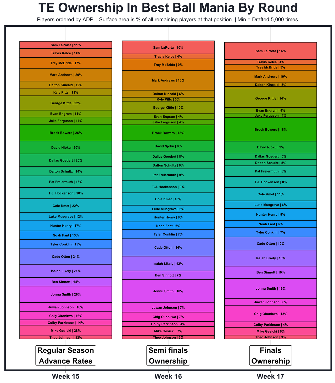 There was just a single "Elite TE" this year, and he wasn't drafted as such. Kittle was the TE7 in ADP and easily finished as the TE1 in fantasy points over replacement on a 23% advance rate, which was suppressed by the correlation of massive teammate busts in Christian McCaffrey, Brandon Aiyuk, and Deebo Samuel. Of course, those injuries did help his target counts, which was the primary reason of concern heading into the year. Without them, he would've been drafted as the TE1 overall. Luck matters to a degree in fantasy football, but it helps to get lucky when the talent is at a Hall of Fame level and when the scheme is world class. Kittle's target competition in 2025 won't be terrifying with both CMC and Aiyuk coming off injury and Deebo likely playing elsewhere. If he's not the TE3 overall just behind the younger Brock Bowers and Trey McBride, I'd be quite surprised. Kittle's 23rd overall finish in fantasy points over replacement from last year likely puts him in the Round 3 discussion.