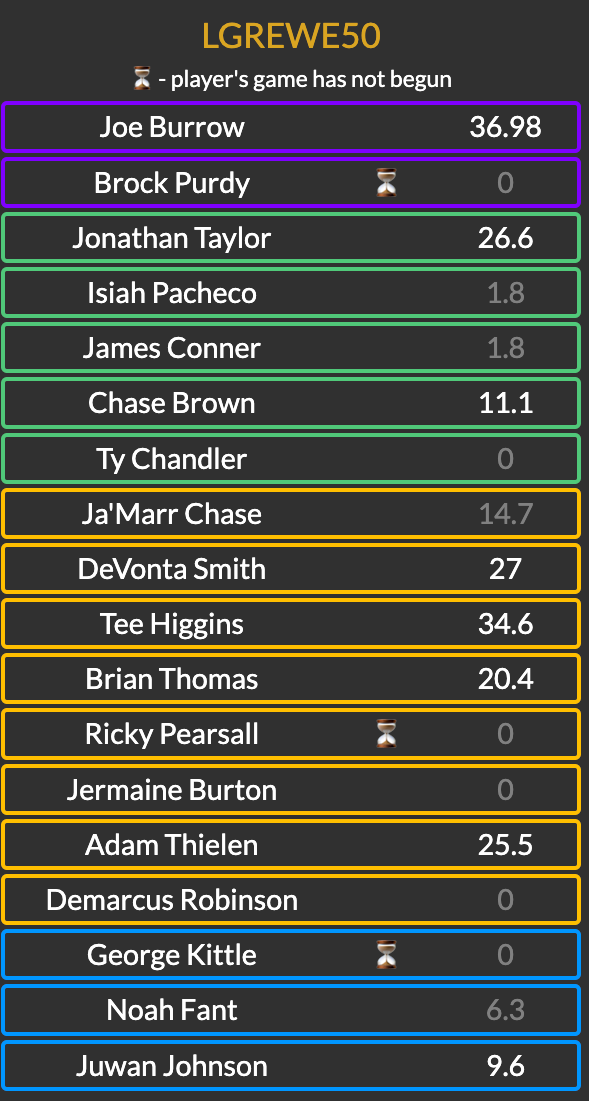 This takes a little nuance because he missed 5 games, but Higgins was dominant when active and hit a ceiling when it mattered most, even with Ja'Marr Chase owning the triple crown. Higgins was the WR28 in ADP and finished the regular season as the WR25 in total fantasy points over replacement. On a per game basis, that's WR9 production, which was more than enough to finish with an above-average 23% advance rate. But then he got really hot in the fantasy playoffs, ultimately finishing as the WR1 overall in Week 17 (34.6 half PPR points). In best ball tournaments, the Joe Burrow double, triple, or quadruple stack was beyond elite. The team that won the $1.5M prize took all the points Chase provided throughout the regular season to advance, then used Burrow-Higgins in the finals to win it all. That's the ping-pong effect of the best ball scoring system working to his advantage. And it was clear that if Chase would've been hurt at any point this year, Higgins would've had an even bigger season. Hopefully he remains in Cincinnati next year. If so, Round 2/3 turn at the very least.