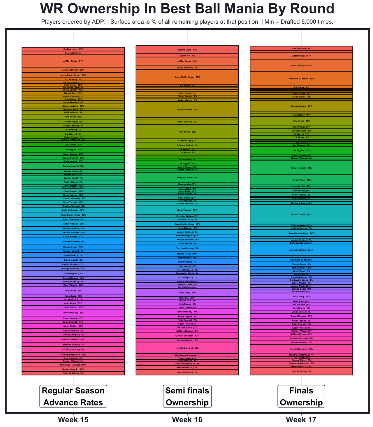 He won the damn triple crown despite not participating in training camp for contract reasons and despite Joe Burrow's scary offseason wrist surgery. Neither mattered at all, as Burrow clearly played an MVP level with better athleticism than we've seen from. Chase's 51% advance rate was the best in the 5 years of the Best Ball Mania Era, and his fantasy points over replacement per game (+13.1) was the second best of the season only behind Saquon Barkley. Chase is undoubtably that the Spike Week King, too. Over the last 5 years, Chase owns the 2nd, 3rd, 7th, and 16th best single games in half PPR among all WRs, and only post-prime Tyreek Hill and Davante Adams are in the same conversation, which is great news for Chase moving forward. He will be the consensus 1.01 next year.