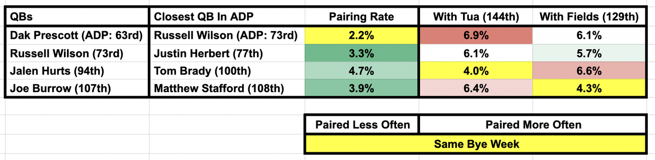 Last year, QBs with very similar ADPs in the Round 6-12 range were paired together 3-4% of the time compared to 6-7% of the time when their ADPs were separated. For example, Russell Wilson (ADP: 73rd) was paired with Justin Herbert (77th) just 3.3% of the time compared to 6.1% and 5.7% with Tua Tagovailoa and Justin Fields, who were both going much later in the draft. The same was true with Jalen Hurts/Tom Brady/Justin Fields and Joe Burrow/Matthew Stafford/Tua Tagovailoa. And to no surprise, Dak Prescott and Russell Wilson were paired together only 2.2% of the time as they both 1) shared the same bye and 2) had similar ADPs.