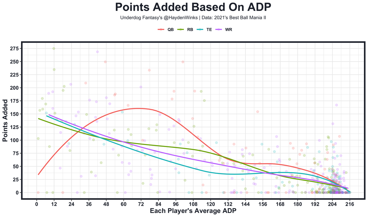 The strategy I like best after looking at this data is targeting a player with an ADP in the 190-205 range in Round 16. A player with an ADP of 195 projects basically as well as a player with an ADP of 175, but the drafted rate goes from 75% to 25%. And since players with an ADP of 190-205 largely go undrafted already, I’m fine with stockpiling this range in Rounds 16, 17, and 18 rather than looking in the 0-1% drafted rate bucket of players who typically don't even get offensive snaps.