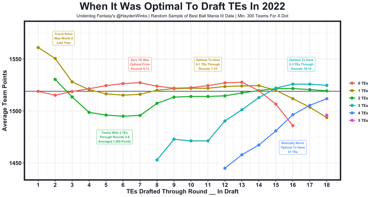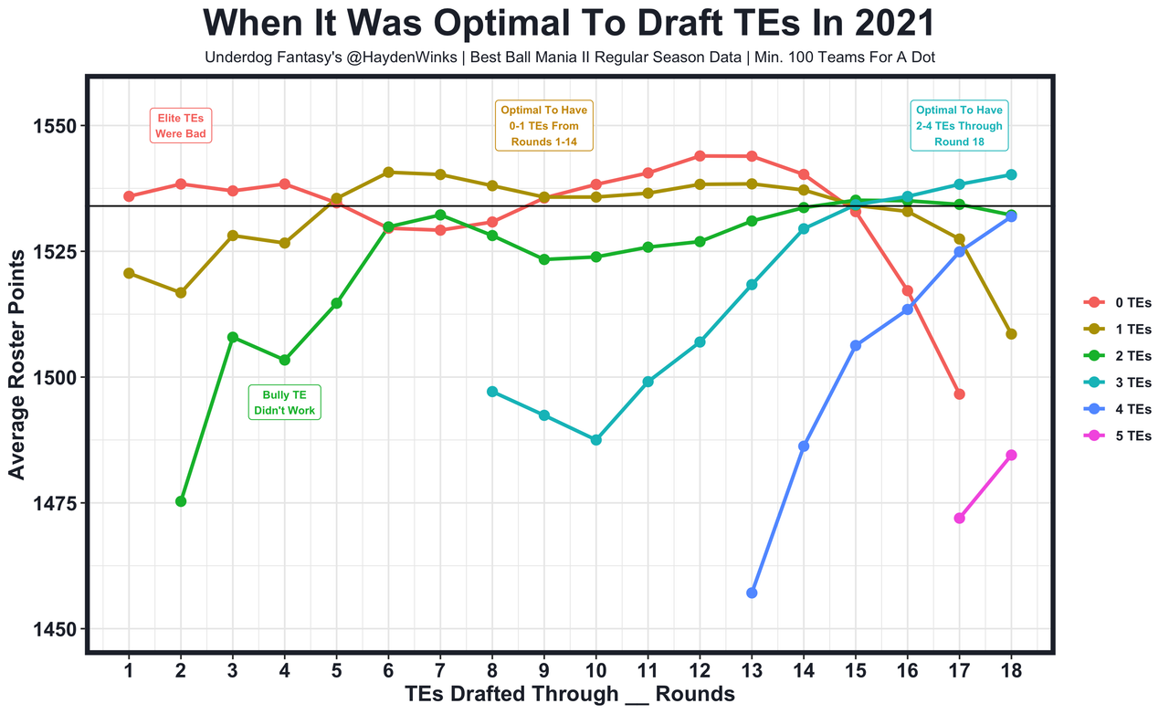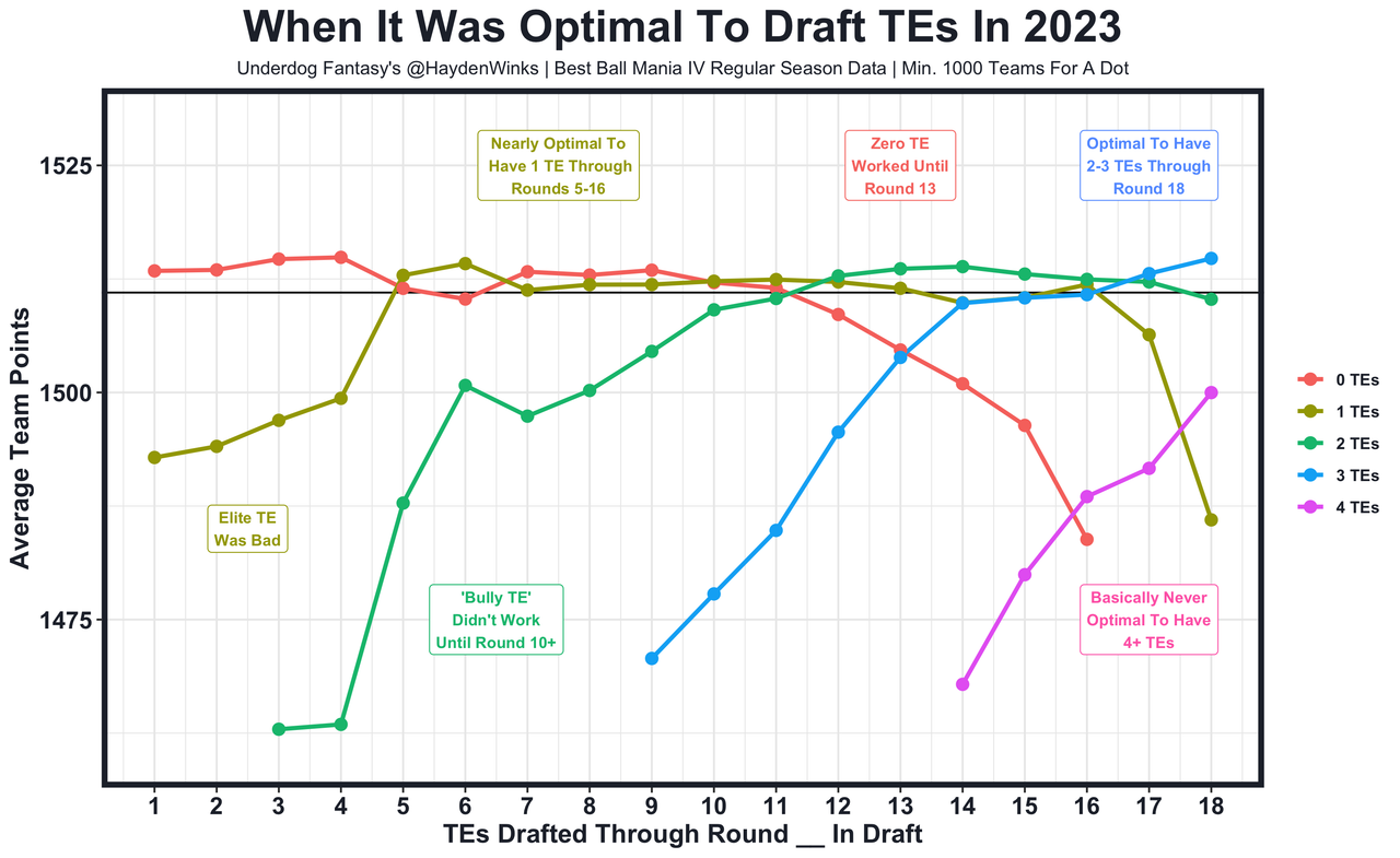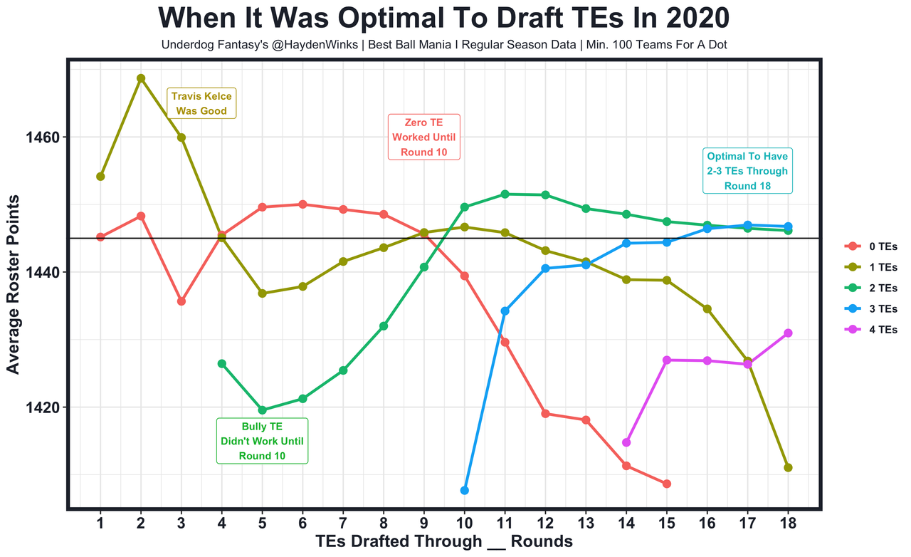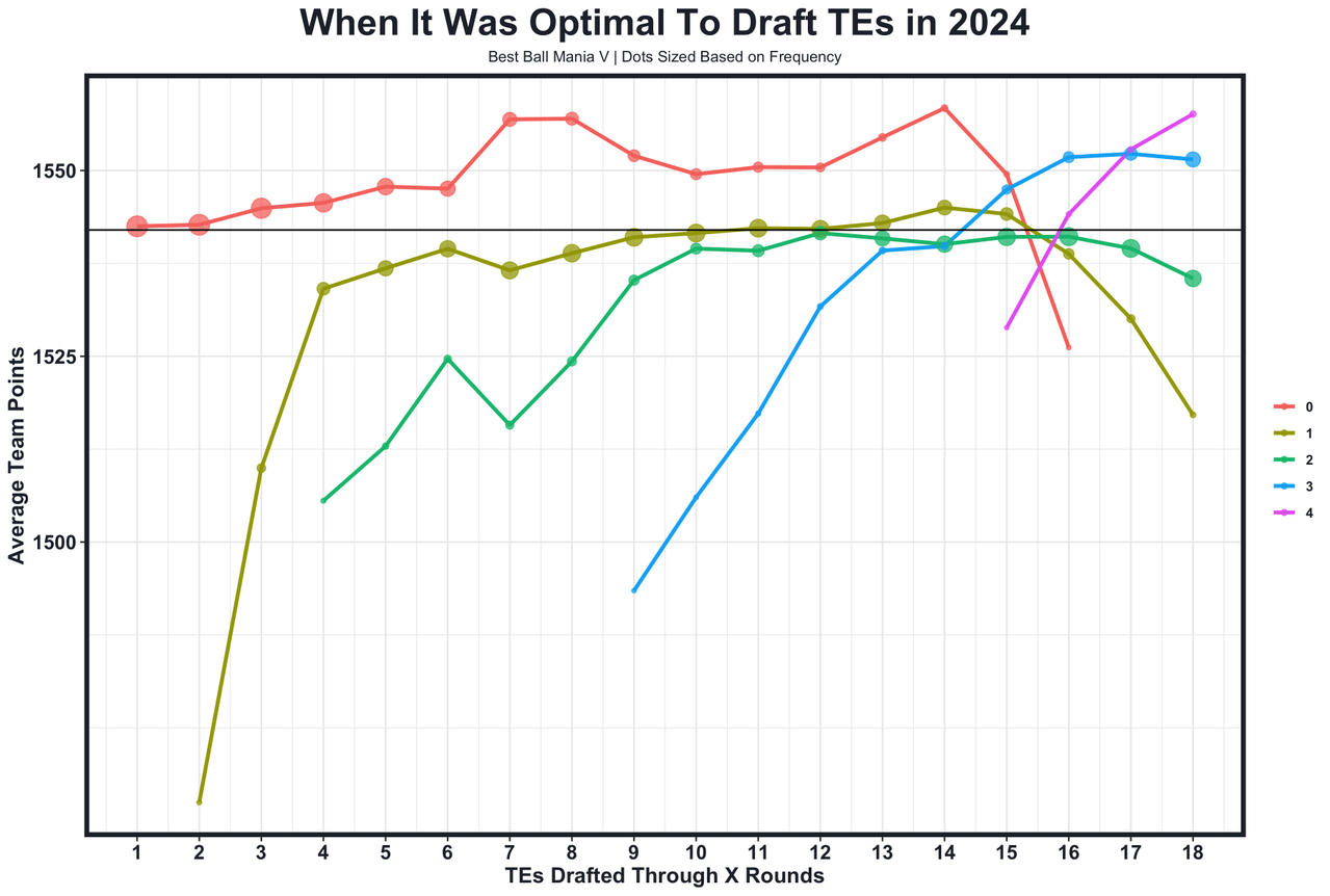 Having 0-1 TEs Through Round 9... "Bully TE" (2 early TEs) can work in theory, but it has been a very below-average strategy in all 4 years. Instead, the highest scoring teams have either punted TE entirely or stuck with their TE1 until the double-digit rounds. Exactly when teams should have their TE2 has varied each year, ranging from Round 10 to Round 17.