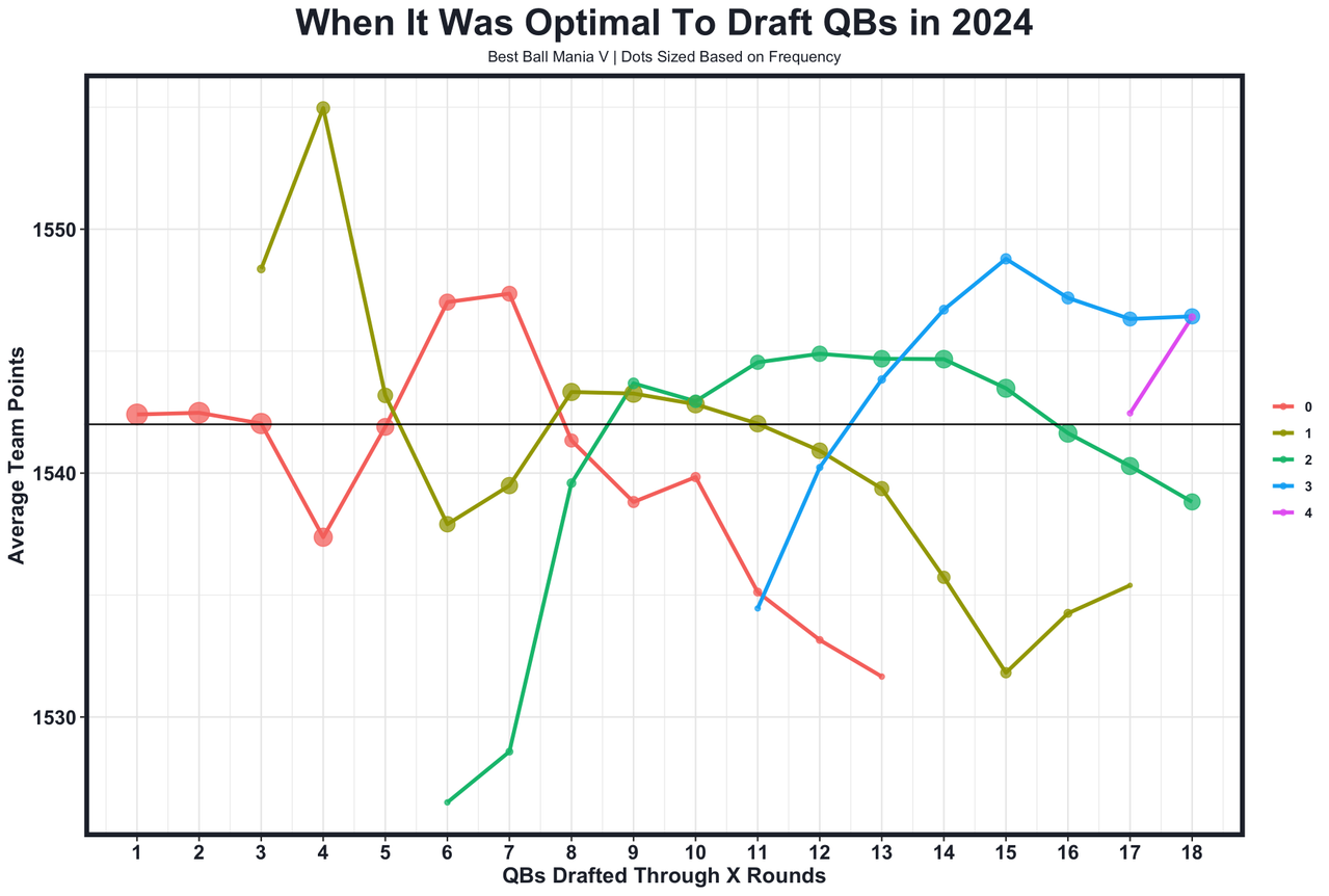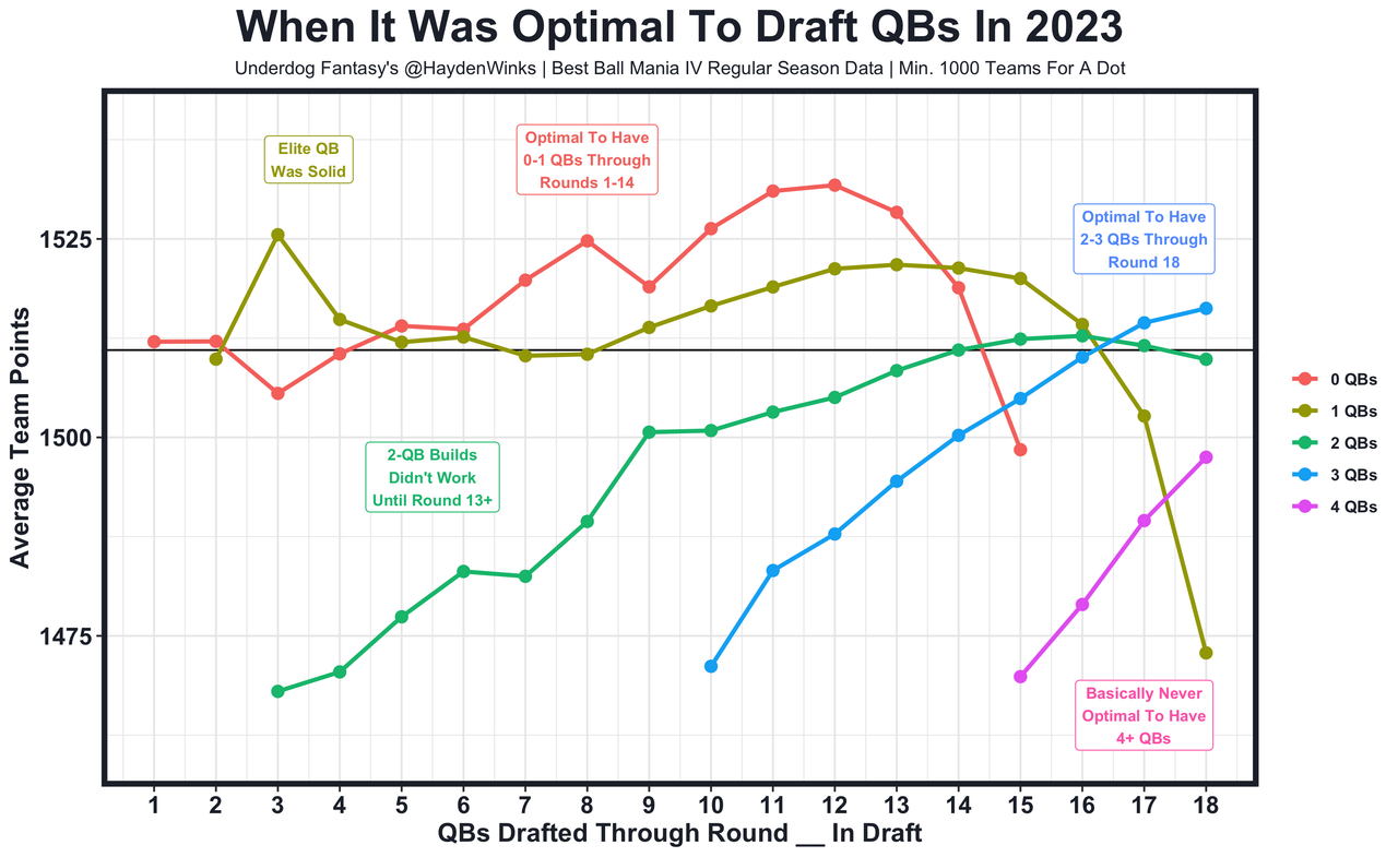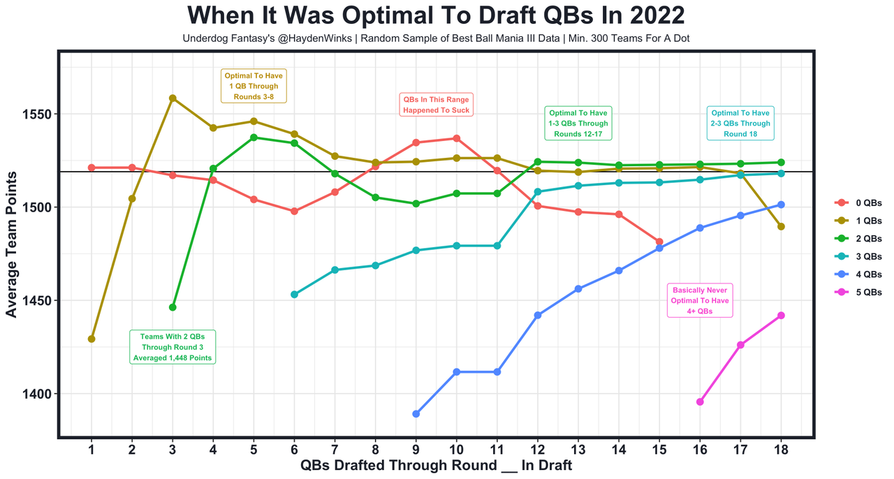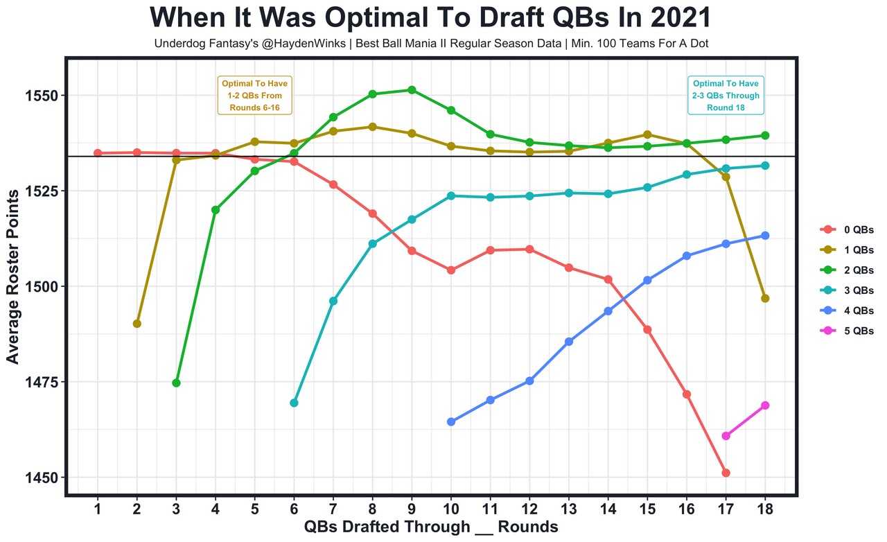 Waiting Until Round 15+ To Draft A QB3... It's been totally optimal to have 2 QBs in two years and totally optimal to have 3 QBs in the other two years of Best Ball Mania. Drafting a QB3 or not will depend on the upcoming season projections and how early we drafted our QB1 and QB2. If we do opt for a QB3, then it's been best to wait until Round 15-18. I especially like this strategy early in offseasons when we can more comfortably project fantasy points from these QBs than the highly uncertain RBs and WRs that are drafted in the very last rounds. For what it's worth, 3-QB builds have been great in back-to-back years.