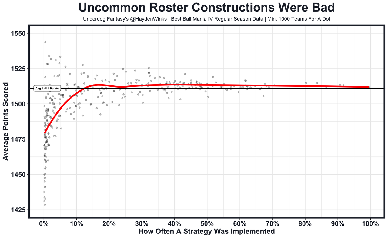 Galaxy-Braining Roster Construction... I want to be careful here because there are a couple ways that pushing the limits of roster construction can be advantageous when done properly, but generally, if your team looks really uncommon, then it's bad. Another win for the wisdom of the crowds. What the chart below shows is that the more common a roster is built, the more likely it is to produce above-average fantasy points. When a strategy is implemented just 0-5% of the time, it's usually bad. For example, the 2% of teams that drafted 4 RBs through Round 6 last year only averaged 1,471 points, which is notably different than the 1,511-point average team. If you're trying to get unique, then there are other ways to do so without risking roster construction failures. I wrote about Uniqueness Strategy in this 2022 column that had some of my favorite charts I've ever built.