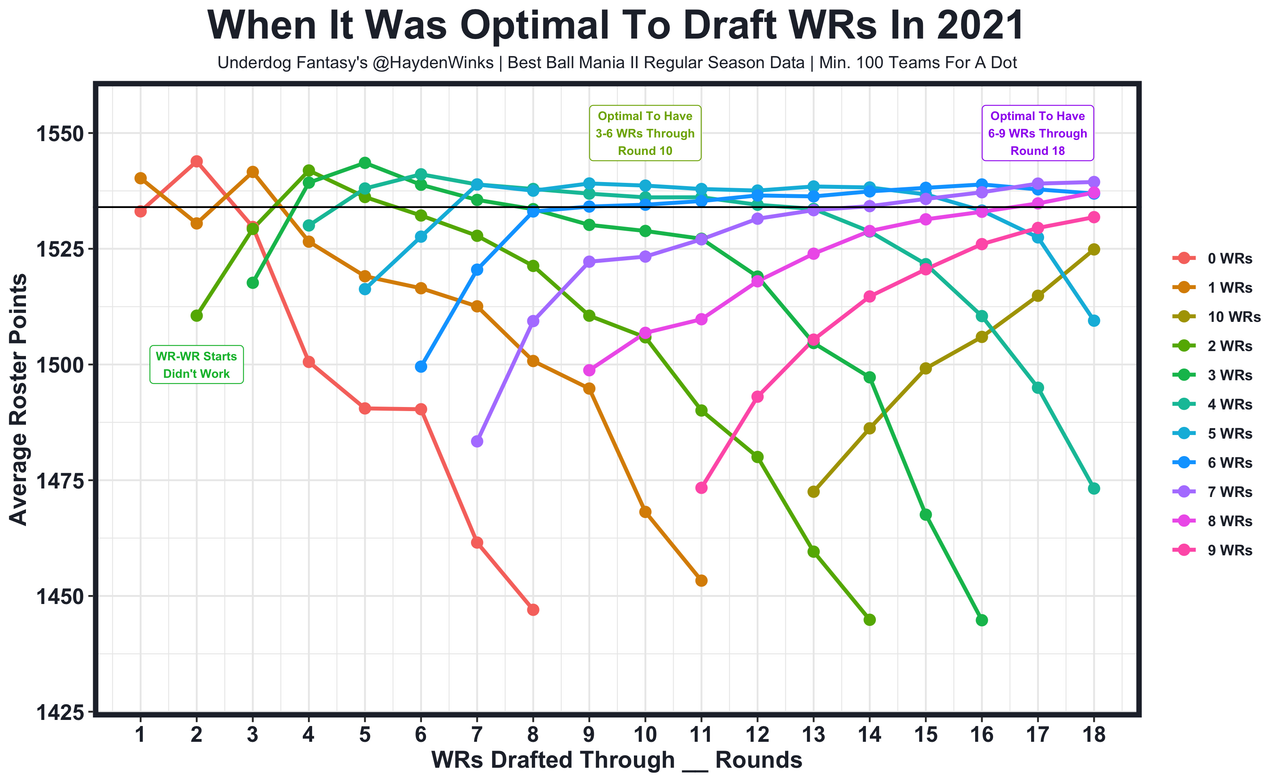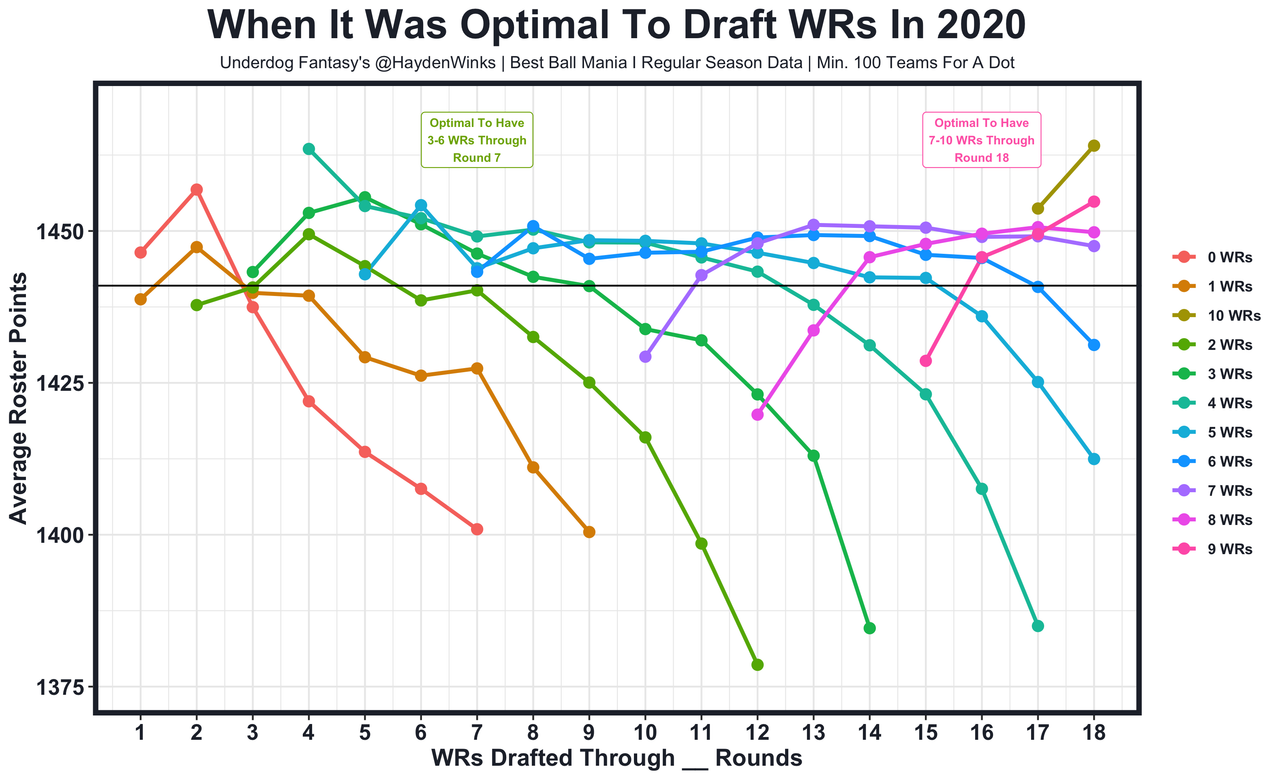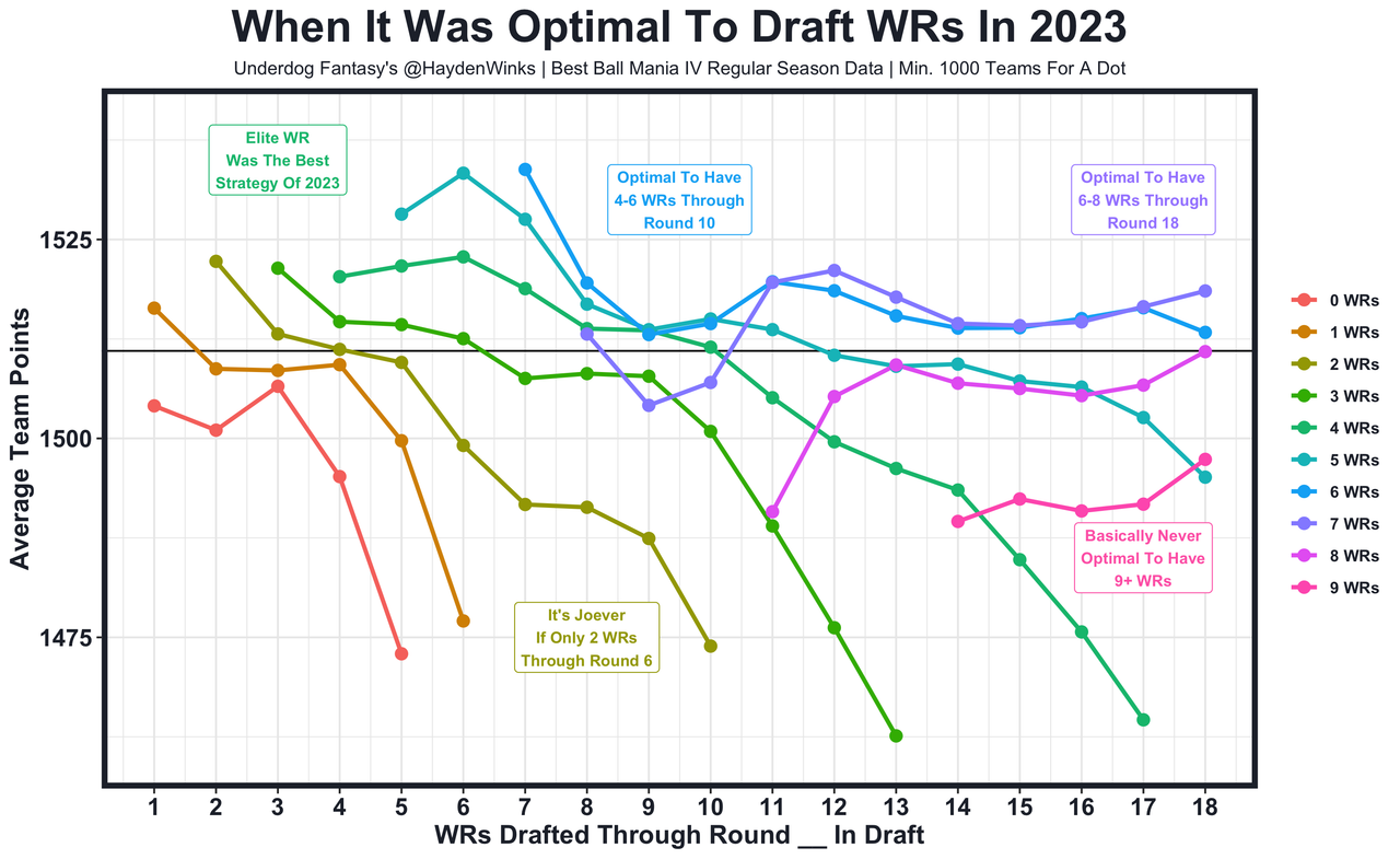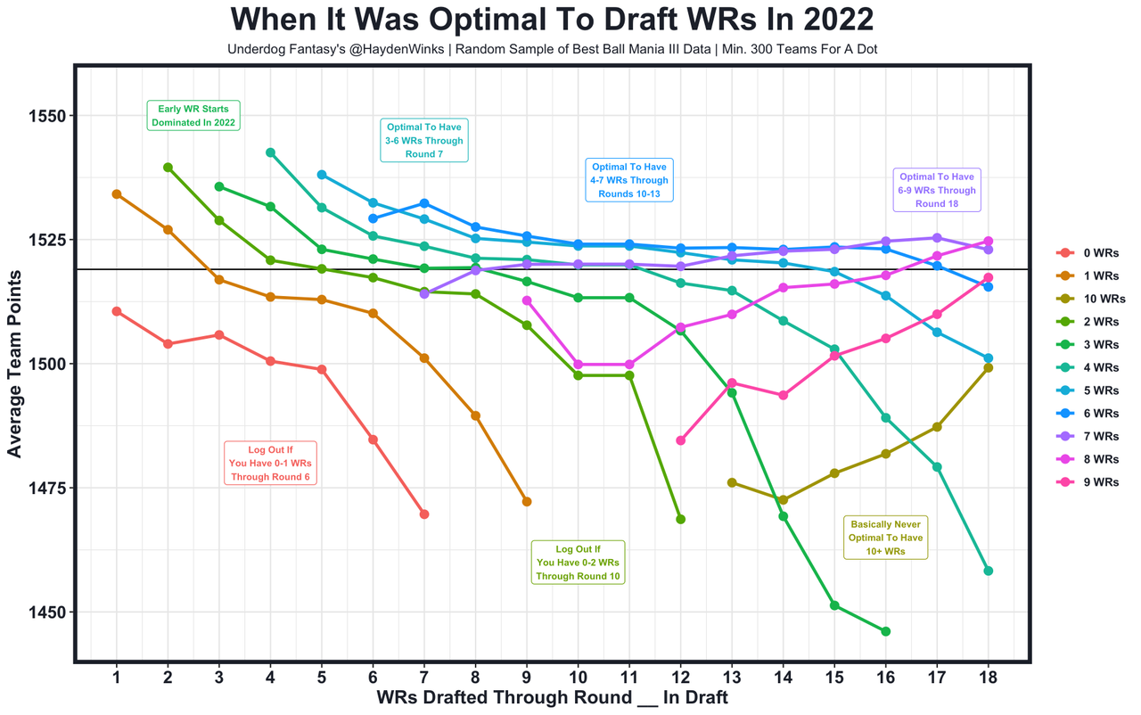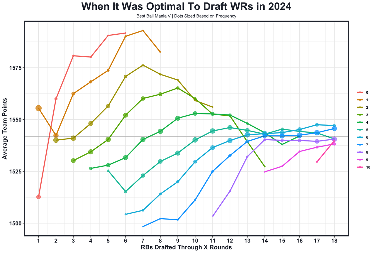 Having 3 WRs Through Round 6... Back in 2021, the "Golden Rule Of Best Ball" was 4 WRs through Round 7, but the price tags of WRs have gone up and my stance has changed a tiny bit. Compared to other fantasy positions, there are fewer late-round WR breakouts and fewer stone-cold busts, which means more of the spike weeks come from the early- to mid-rounders. All still true. The difference is that we can simply start a RB in the flex in half PPR if the price tags on each position allow it. That's the case in 2025. In every year, it's been nearly optimal to have 3 WRs through Round 6, so that's my general stance. But things have swung massively depending on the season if it's been better to have 4-5 WRs or just 1-2 WRs in the early rounds. BBMV's lopsided results even said having 0 WRs was optimal (!!!), but in BBMIII and BBMIV, it was optimal to have 5 or even 6 WRs. In either outcome, having exactly 3 WRs to fill those starting 3 WR spots has finished above the average scoring roster in all five years of the tournament. That checks out logically, too.
