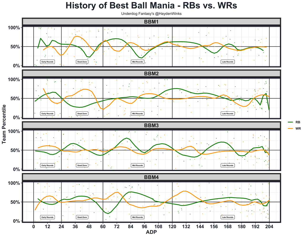 For example, just look what would've happened if you only drafted RB-RB teams after BBMI and BBMII hits. Or look what would've happened if you blindly faded Round 3-5 RBs after BBMI and BBMII because of the "RB dead zone" without acknowledging how ADPs have changed. These zoomed in trends and strict definitions of strategies often lead us the wrong way: