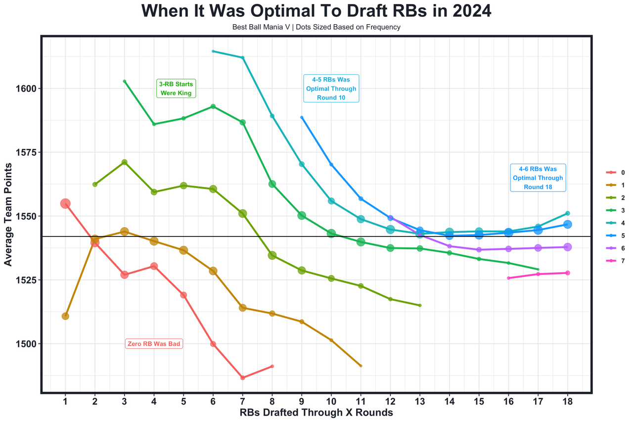 Having 2 RBs Through Round 6... The optimal amount of RBs to have at certain points of the draft swings so dramatically year over year. Some years, it's been undeniable that having 0 RBs was best. In other years like in BBMV, it's been undeniable that having upwards of 3-4 RBs early was best. There's simply not a guaranteed answer here, but the best we have year-over-year has been 2 RBs through Round 6. It's finished above the average score in every season despite the ebbs and flows of the positional volatility.