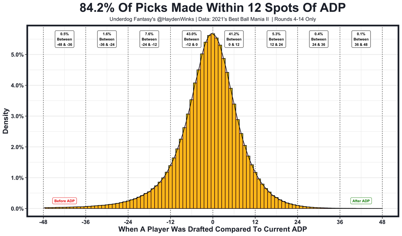 Reaching For "Your Guys"... Because the "wisdom of the crowds" is generally so good, we're best off sticking around ADP. Teams that continuously reach 5+ spots in ADP lose points every year, while teams that scoop up ADP value are gaining points every year. This does not mean we can't have player takes. It just means that even if we really like a player, it doesn't give us permission to draft him a round early every single time. We can easily get to 20-33% of a player if we only draft them within 5ish spots of their listed ADP. I wrote about reaching in detail here. There's some cool charts and concepts. In fact, I think some of these concepts (like odds a player will be available by your next pick) will turn into best ball tools shortly.