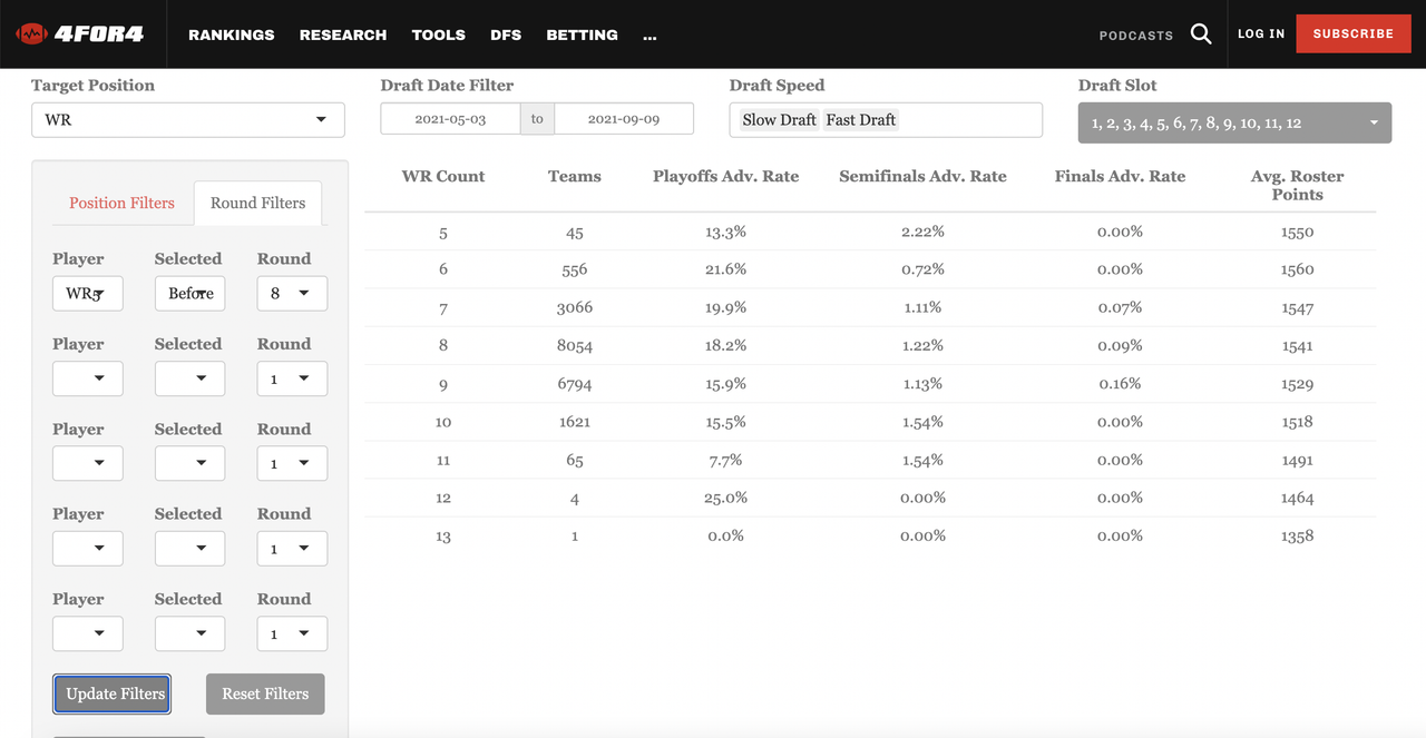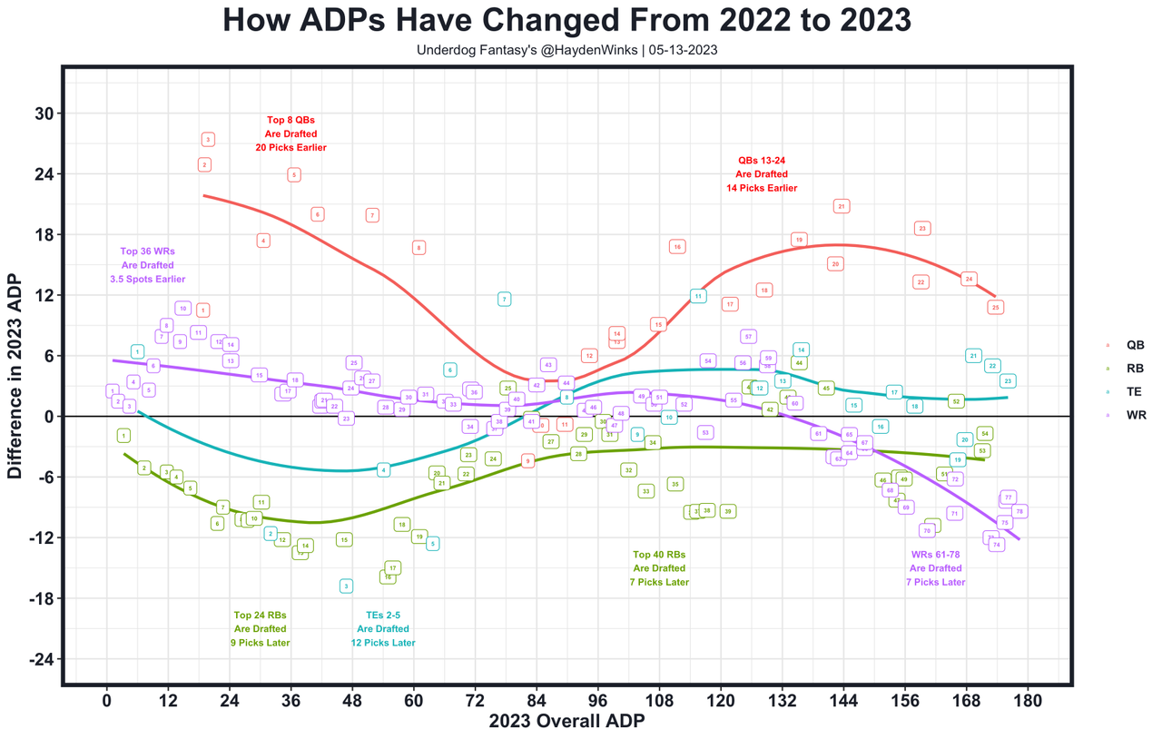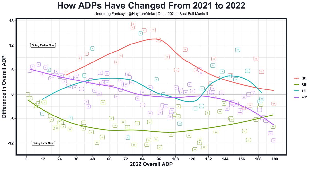 If this trend continues, I like the strategy of getting 4 stud WRs relatively early and sprinkling in more RBs than usual in this Round 6-12 range. That was the premise in Radicalized Zero RB, too.