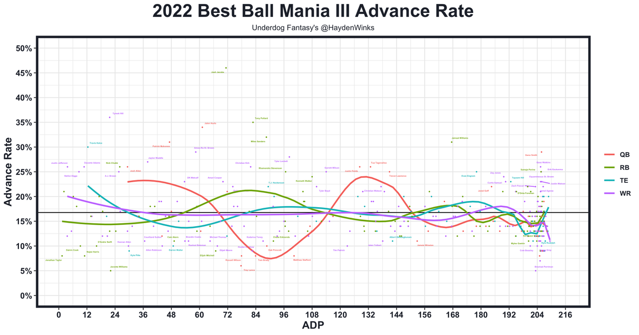 There are three years of Best Ball Mania drafts to comb through now, which is at least increasing the sample size of what things are generally optimal. While I agree that we're in very small sample territory, I do want to push back some on the "best ball season is just one slate" narrative, meaning the entire 2022 season was just one iteration of the simulation so we can throw out historical data.