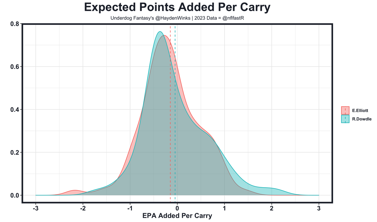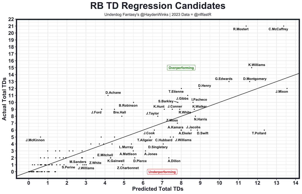 Kyren Williams - The power run game isn't going anywhere. It led to the 11th most expected points last year, and an outlier 2nd overall finish for Williams. Blake Corum is at least a direct handcuff but likely steals 10-25% work from him directly. This would reflect that drop-off.