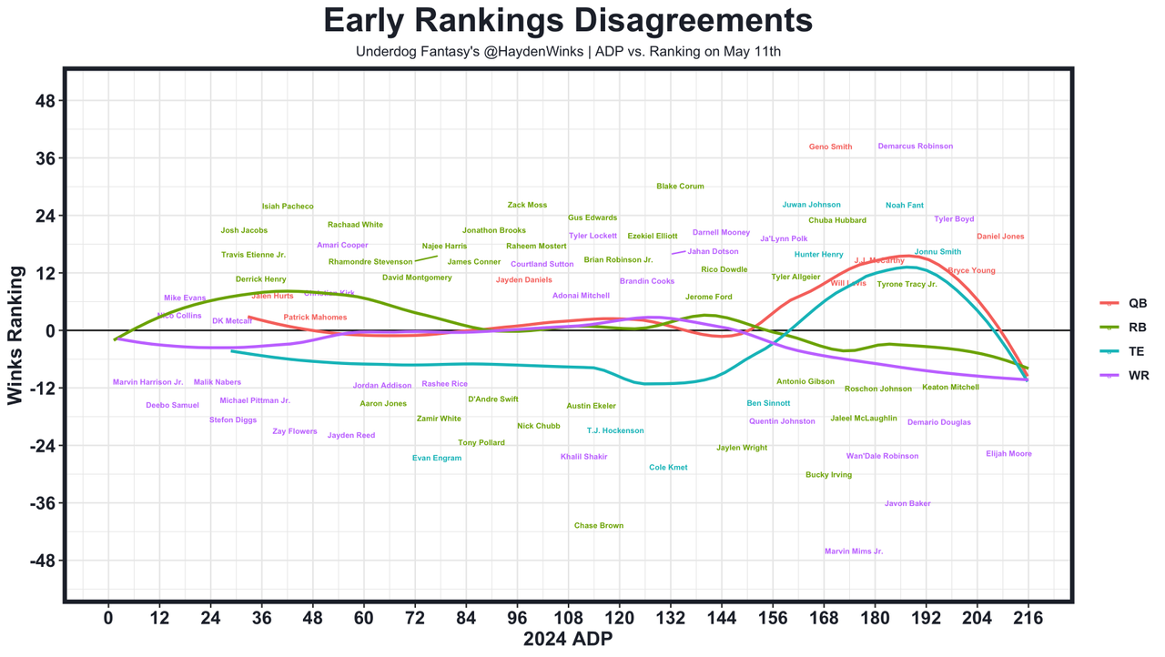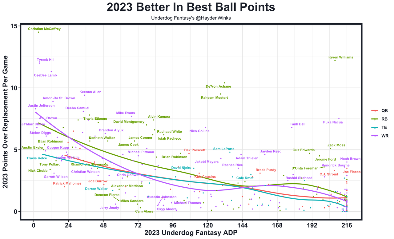 The ADP is based on the starting draft position on Underdog Fantasy. 2023 and 2022 Finishes are my fantasy points over replacement metrics based on Underdog Fantasy's half PPR best ball scoring, which factors in weekly upside. It's important to note that I don't encourage reaching on Underdog Fantasy, even if I have a player ranked well ahead of ADP. Get your guys, but get them at reasonable ADPs. More times than not, the player you want will be drafted within 5 spots of his ADP. Be patient.