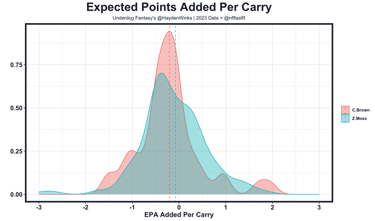 Zack Moss - Few were better on shotgun runs last year, something the Bengals are going to major in once again. Moss earned a $4.5M guaranteed contract this offseason, essentially the same contract they had in line for Joe Mixon who has finished 21st and 35th overall in this Bengals offense. The OL looks better in Cincy this time around, and Chase Brown is so unproven despite a maxed-out athletic chart. Almost all of his production last year came as a screen merchant. Do we think that translates to running the ball? Color me skeptical. Moss in a land slide for me. He's at 850 rushing yards and 6.5 TDs in the Underdog Pick'em Lobby.