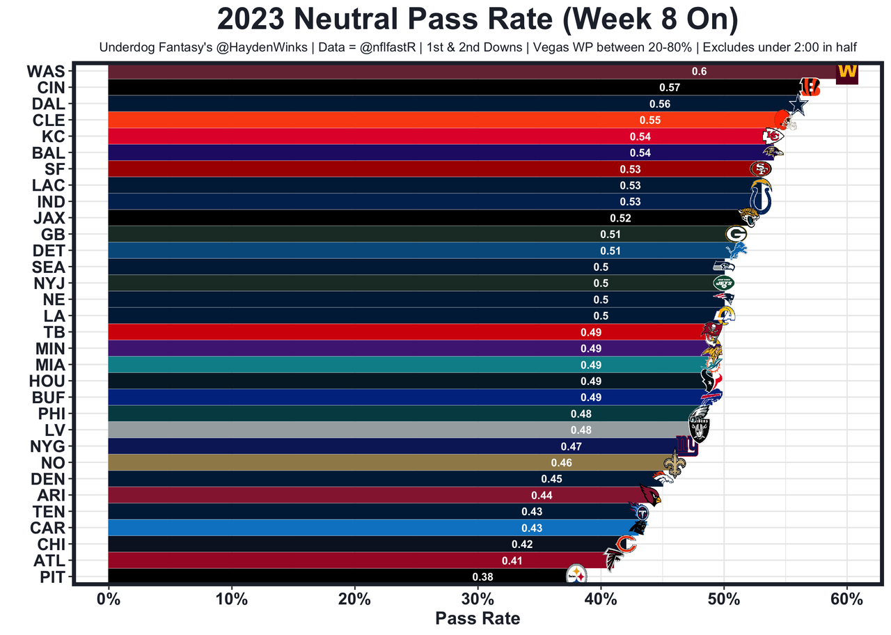 Rhamondre Stevenson - In two of the worst offenses every assembled, Stevenson has pulled off 29th and 64th overall per game finishes over the last two years. Ezekiel Elliott is replaced by the overrated Antonio Gibson, and there's a chance Drake Maye (or even Jacoby Brissset) makes this a watchable offense this year. OC Alex Van Pelt has been the Browns coordinator since 2020. Did they run the ball? I forget.