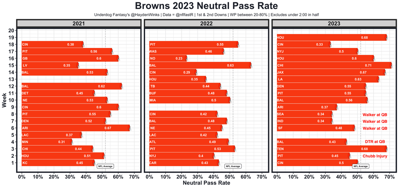 37. WR22 Amari Cooper - Cooper is priced as if we know Deshaun Watson is going to be awful. Is that likely? Sure, but there is room for a minor bounce back that isn't being priced in. Cooper has finished 27th and 33rd overall in fantasy points over replacement per game in unideal circumstances, and we've seen the Browns flip their offensive identity with Nick Chubb exiting his prime. In fact, if we remove the 4 weeks where the Browns had P.J. Walker or Dorian Thompson-Robinson as their QBs, the Browns had the 4th-highest neutral pass rate in the NFL last year. Cooper averaged 14.9 half PPR points in those 11 non-CFL QB games, which would've made him the WR10 per game last year. He's drafted as the WR30 on Underdog Fantasy. Amari will be 23 years old this season, of course.