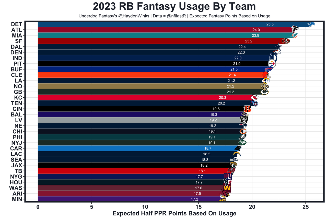 4. WR2 Justin Jefferson - In healthy games, Jefferson was the WR1 overall in half PPR points per game (20.3) on WR2 overall fantasy usage. Some of that was with Kirk Cousins. Some of that was with QB play that'll be worse than the combination of Sam Darnold and J.J. McCarthy this upcoming season. Jefferson's 15.6 expected half PPR points were notably higher than Tyreek Hill's (14.5), Ja'Marr Chase's (12.3), and Amon-Ra St. Brown's (13.6). Let's keep it simple... Oh, and his 4-game sample after returning from injury without Kirk Cousins: 84, 141, 59, and 192 yards with 10+ targets in all. That's a 2,023-yard pace across 17 games.