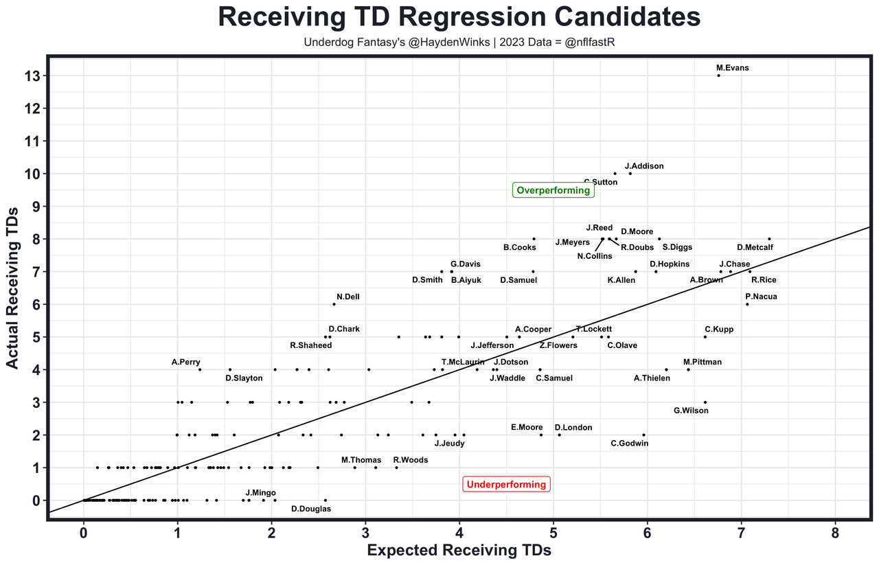 29. WR19 Mike Evans - He still had it last year. Evans has finished with +30%, +15%, +27%, +34%, +11%, and +31% fantasy points over expected despite playing in new offenses with new quarterbacks. The constant is Evans' downfield and red zone dominance. Last year's +31% fantasy points over expected were catalyzed by scoring 6.2 more TDs than his usage would indicate. That was the largest difference among WRs. He's not going to reproduce that again in 2024, especially after losing OC Dave Canales. But the 31-year-old also doesn't have to, compared to his WR18 Underdog Fantasy ADP. Evans was the per-game WR9 on WR14 usage last year and was the WR7 in weekly best ball points because when he scores points, he really scores points.
