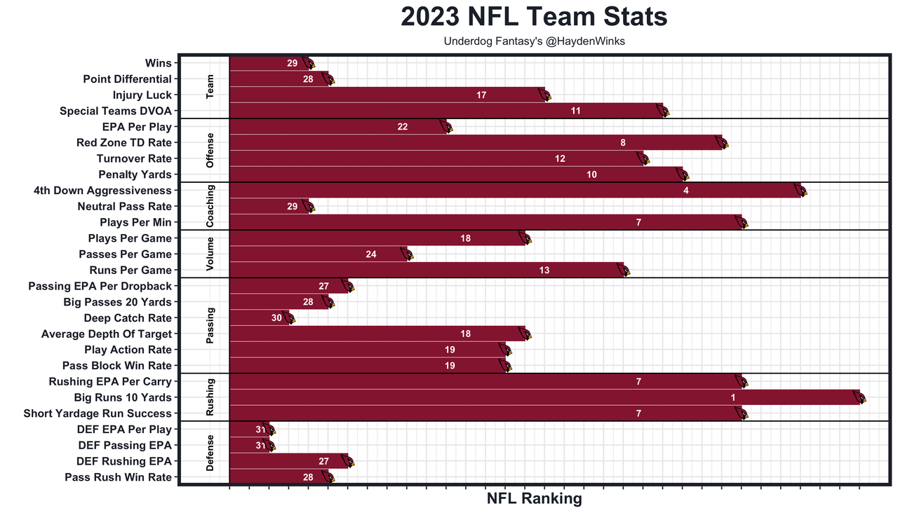 26. WR17 Marvin Harrison Jr. - He's going to be a great pro long term and even a quality fantasy asset as a rookie, but this is by far the highest a rookie WR has ever gone in drafts and he's still attached to an offense that's 21st in projected points this year in a likely balanced offense. From Week 8 on last year (primarily with Kyler Murray), the Cardinals were 27th in neutral pass rate, which aligns with the roots of the coaching staff (Eagles and Browns). Harrison has to be an absolute star to overcome this average environment at the Round 1/2 turn. Our Underdog Fantasy player projections agree. He's at 1,075.5 receiving yards and 7.5 TDs in Pick'em. Those numbers are closer towards my ranking (WR14 and 20th overall).