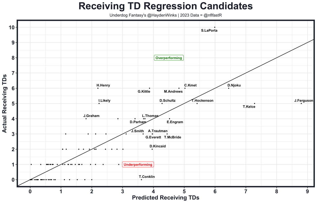 44. TE2 Travis Kelce - Arguably bored of the regular season, Kelce still has glimpses of being the top-20 overall fantasy asset at times, but the overall output has fallen off heading into his age-35 season. He scored +29%, +28%, and +17% fantasy points over expected before that dropped to +6% in the 2023 regular season. His usage also was at a 7-year low. Kelce has his work cut out to be an "elite fantasy TE" with two primary additions to the receiver group, though the market isn't pricing him nearly as high on Underdog Fantasy (38th overall) as he was in the year's previous. Kelce was 56th overall in best ball points last year.