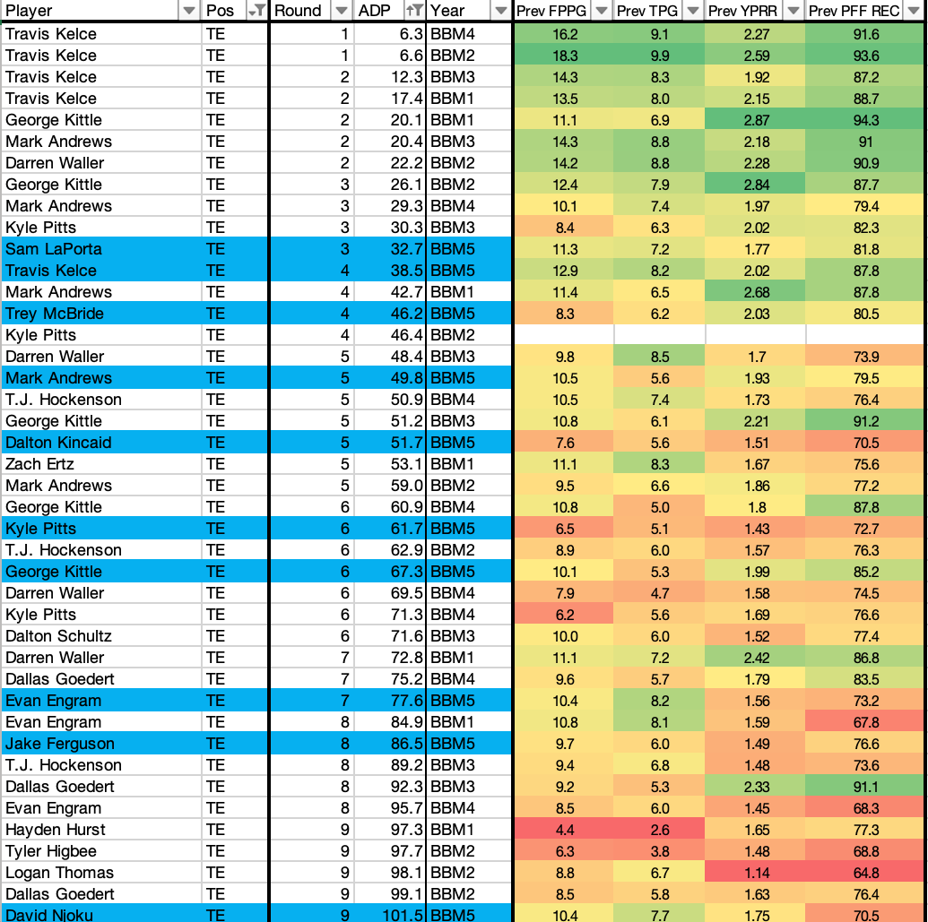 This table compares every Round 1-9 TE that's been drafted in the five years of Best Ball Mania on Underdog Fantasy. The numbers on the right are the most important production and efficiency stats from that TE's previous season. Njoku's profile looks better than every TE that's been drafted in Round 8 or Round 9. He seems undervalued after balling out late in 2023.