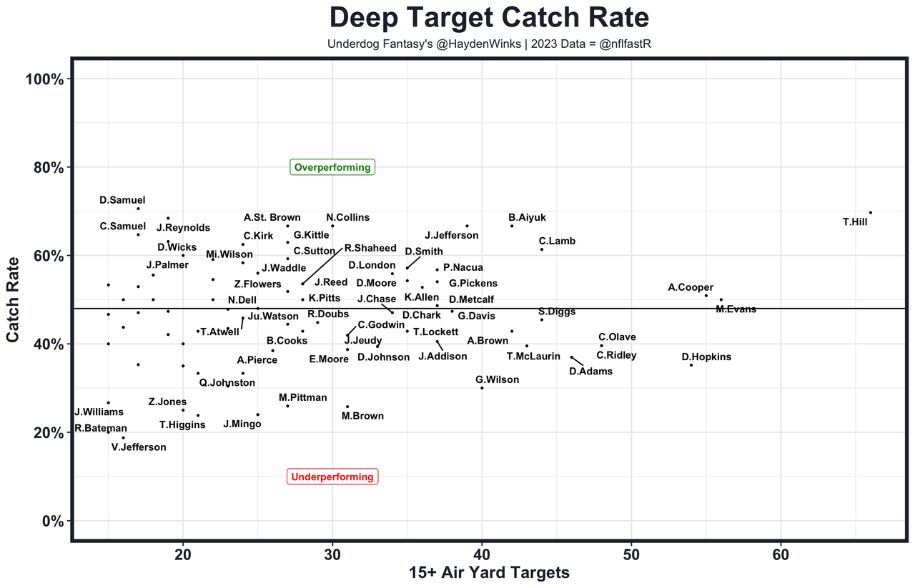 40. WR25 D.J. Moore - After tilting seasons with the Panthers, Moore made the most out of a new situation last year. He was +36% over expected (WR10), leading to a WR13 finish on WR26 usage. He did so by dominating on downfield targets. His +14% completion percentage over expected on targets of 15+ air yards were the 15th best in the NFL, and they helped him score 2.3 more TDs than expected (18th best). Doing so with Justin Fields at QB was extra impressive, but the improved QB situation is at least partially offset by significantly better target competition (Keenan Allen and Rome Odunze). There should be little confidence in how targets and efficiency will play out in this Bears' receiver room, especially with a new play caller in town, too. He's the WR17 on Underdog Fantasy right now, essentially splitting his production and usage from 2023. That's too rich for me -- regression and target competition are a tough tandem to overcome -- but Moore unquestionably has game-breaking weekly upside.