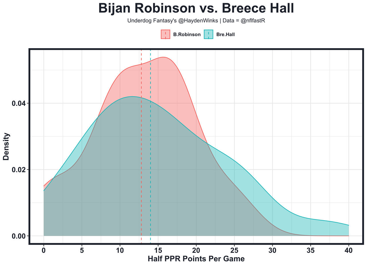6. RB3 Bijan Robinson - There are a ton of similarities between Hall and Robinson heading into the year: potential bellcows with QBs coming off torn achilles. But I feel worst about Robinson's goal-line opportunities with Tyler Allgeier lingering. In fact, he had only 2 carries inside the 5-yard line, which was just 18% of the Falcons' attempts down there. The new coaching staff is far more likely to use Robinson in a 3-down role, but I've at least seen it repeatedly with Hall.