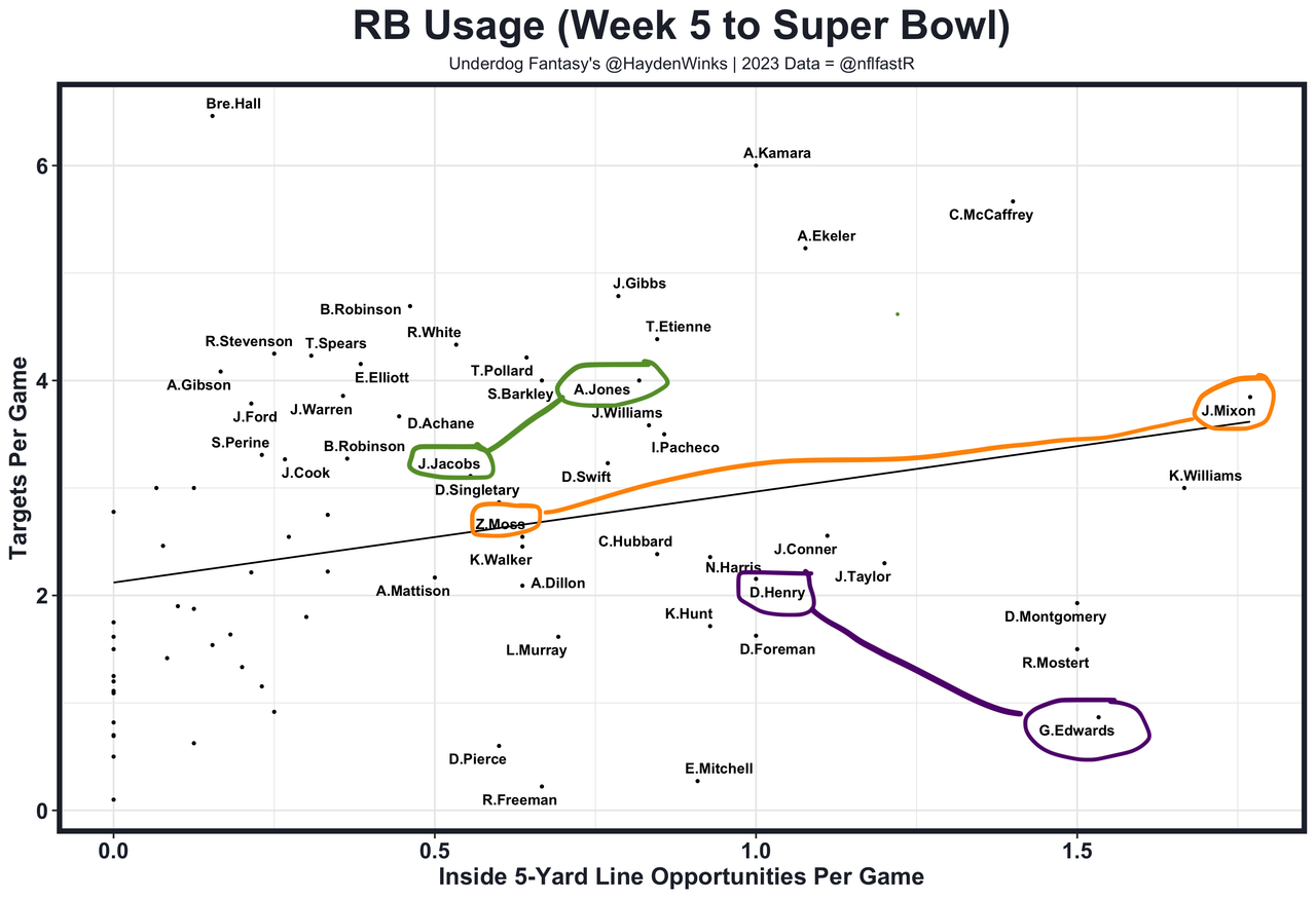 32. RB10 Derrick Henry - The annual top-3 RBs in half PPR points per game over the last 10 years have played on a team who finished over .500 on the season 80% of the time. 47% of these difference-making RBs played on teams above .667, too. The Ravens of course won .765 of their regular season games last year and have the 3rd-highest projected wins (11.5) in 2024. Henry's path to an elite season would come in the form of outlier touchdowns and insane rushing volume. Gus Edwards scored 13 times on 10.6 expected TDs as a part-timer without the big-play ability Henry has, and Henry's 1-year, $9M contract suggests he won't be in the even-split committee that "The Bus" dealt with alongside Keaton Mitchell (ACL-plus) and Justice Hill (1-year, $2M). As the clear workhorse on Titans' teams that won .353 and .412 of their games, Henry finished as the per-game 4th and 23rd overall player in his last two seasons. I'll take my chances that someone built like Henry can fight off the age-30 age cliff. His 2023 yards after contact per carry (3.3), elusiveness rating (64.7), and percentage of yards coming on big runs (33%) were right in line with his career averages... And if we're right on Henry balling out again, nothing will look cooler on TV than Henry in those Ravens uniforms.