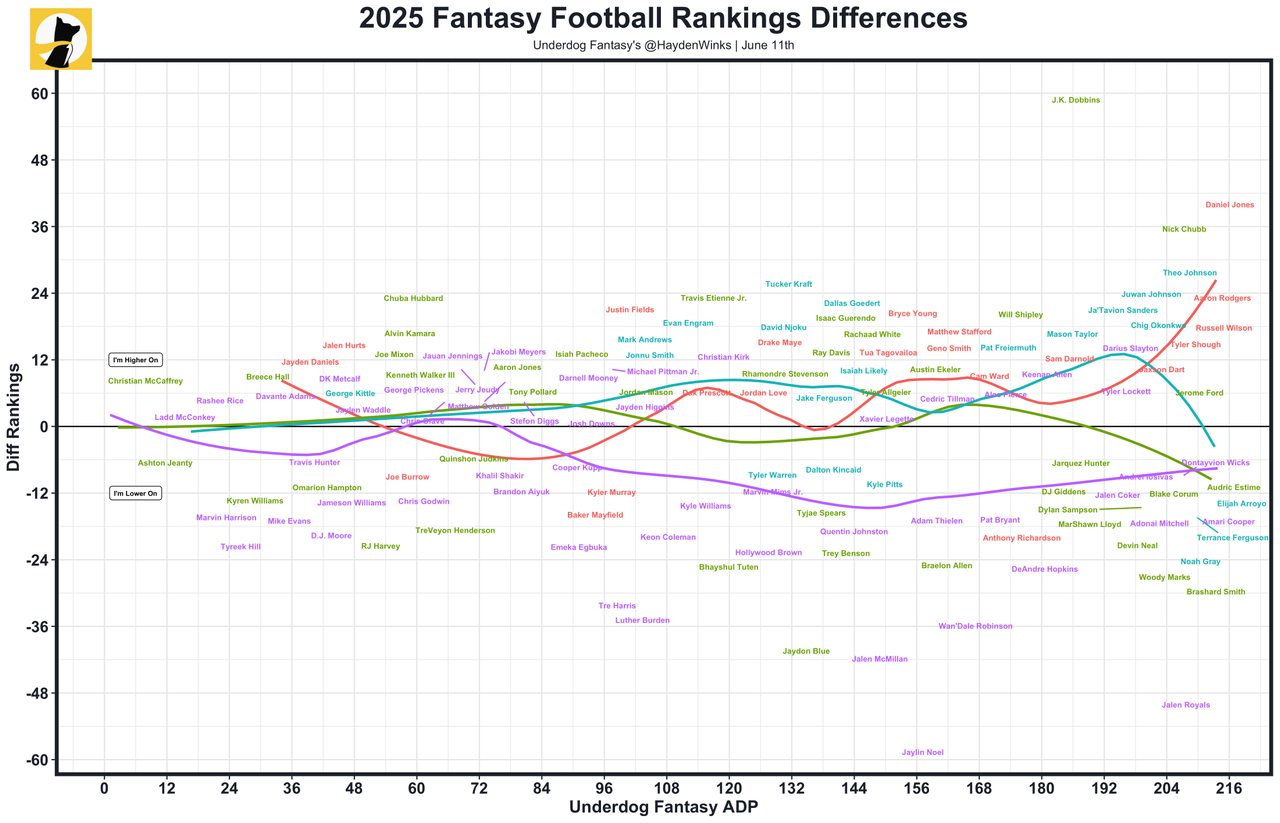 RB2 Omarion Hampton: Not only does he get Round 1 draft capital, but the Chargers are a fantastic landing spot for him once he fully buries Najee Harris. OC Greg Roman had Los Angeles 12th in rush attempts last year despite a poor set of backs, so even if Harris starts out hot, there should be some FLEX appeal early. Harris' lack of speed will be impossible to ignore next to Hampton, who could play passing downs on top of his downhill rushing style. Expect the Chargers OL to have better injury luck this upcoming season, too. Our film breakdown of him is here.