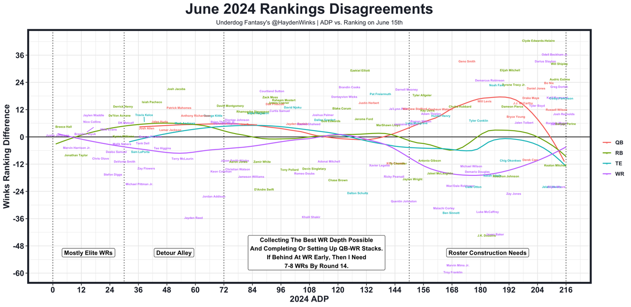 13. WR9 Brandon Aiyuk - The reality is the entire 2nd round is undeserving of their ADPs. Here's where each player finished in fantasy points over replacement per game last year: Garrett Wilson (91st overall), Marvin Harrison Jr. (highest rookie WR ADP of all time), Saquon Barkley (26th overall), Jonathan Taylor (34th overall), Drake London (98th overall), Brandon Aiyuk (28th overall), Davante Adams (33rd overall), Chris Olave (58th overall), Kyren Williams (2nd overall), and De'Von Achane (5th overall)... If you want a WR in Round 2, you are projecting a finish that hasn't happened yet. That's not ideal, but we're all doing it. So who is the best of the worst??? Brandon Aiyuk. He's a consistent model dunker with +14%, +22%, +26%, and +47% fantasy points over expected based on his usage. Aiyuk is an elite downfield player because his route running has improved and he's a fantastic athlete. The 49ers' skill group remains crowded, but if a Deebo trade or just random injuries occur, Aiyuk has the looks of a Round 1 fantasy receiver or at the very least has the looks of a giga spike week receiver. The NFC West offenses look scary and the 49ers' defense isn't as good as it was in their peak, so San Francisco can potentially pass more in 2024 than they have during the Aiyuk era. Volume is the only thing that's held him back so far (WR36 in expected points per game). What if that unexpectedly changes?