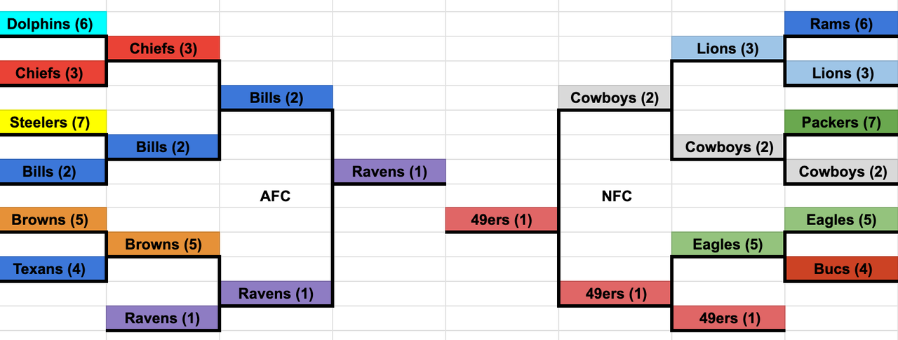 Teams to stack with: AFC contenders (BAL, BUF, KC) ... Likely won't face SF, PHI, or GB until the NFC Championship when it's hardest to advance in the tournament