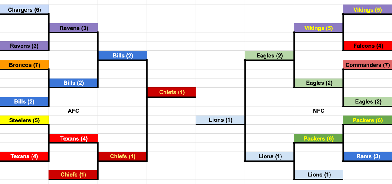 This is a team ascending. Since Week 11 when they reshuffled their secondary to put All Pro Kyle Hamilton to free safety and Marlon Humphrey into the slot, they've been 1st in EPA and success rate on defense. Meanwhile, the offense's peak is the best in football. This is arguably the best team they've rostered, but their path isn't easiest as they'll have to go into Buffalo and Kansas City to reach the Super Bowl. They're best stacked with the Lions, Eagles, Packers, and Vikings... Avoid them with the Bills and Chargers for scheduling purposes.