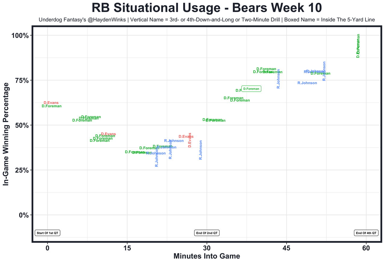 Khalil Herbert - Assuming he's healthy, Herbert and D'Onta Foreman (limited x3) will battle for early-down work while Roschon Johnson can mix in on passing downs. It's very likely to be a full-blown committee with unclear goal line odds, especially with the Lions ranking 2nd-best against fantasy RBs.