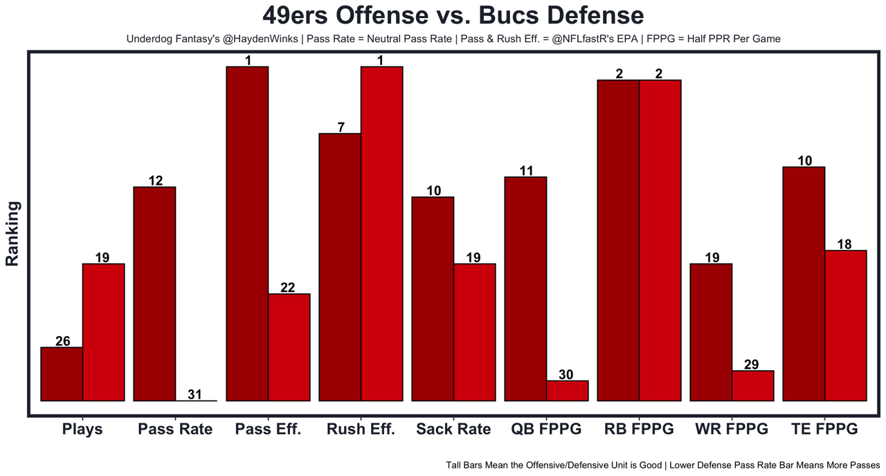 Brandon Aiyuk - Offenses facing the Bucs have the 2nd-highest neutral pass rate, leading to a 29th overall ranking against fantasy WRs. Aiyuk has obvious upside appeal, but it's at least worth noting he's coming off a season-low 4.9 expected half PPR points with the entire skill group back and sits at WR42 in usage this month. 67.5 receiving yards in Pick'em.