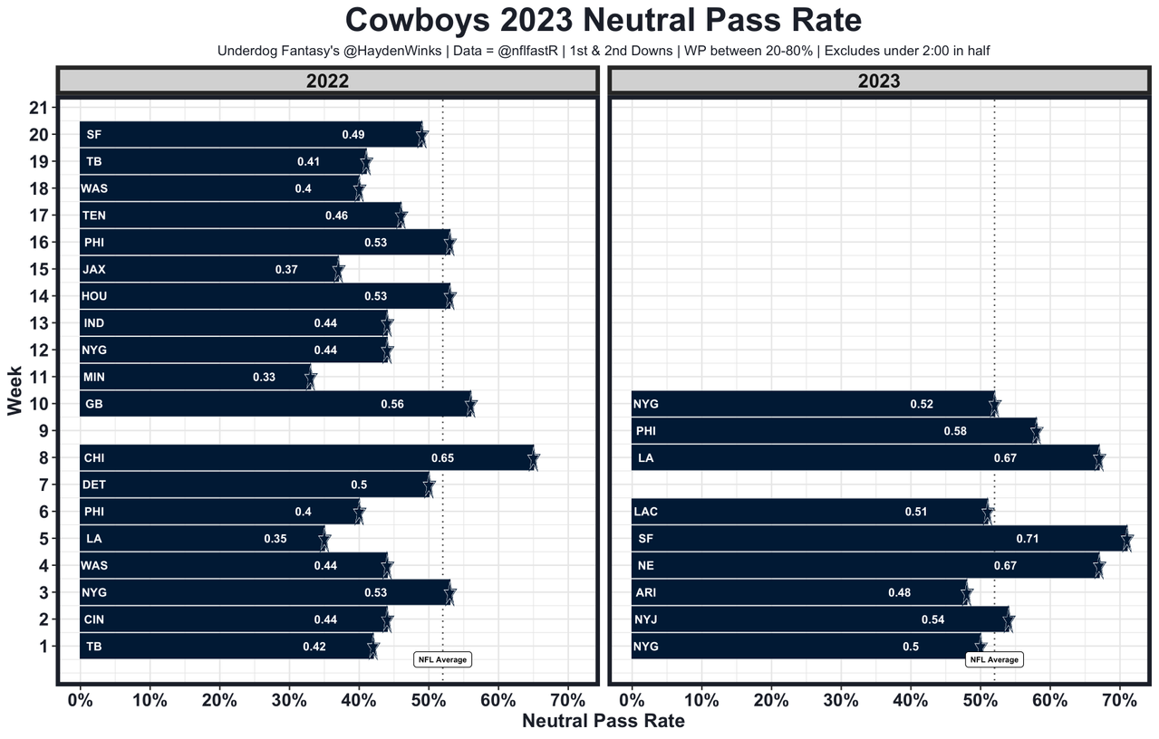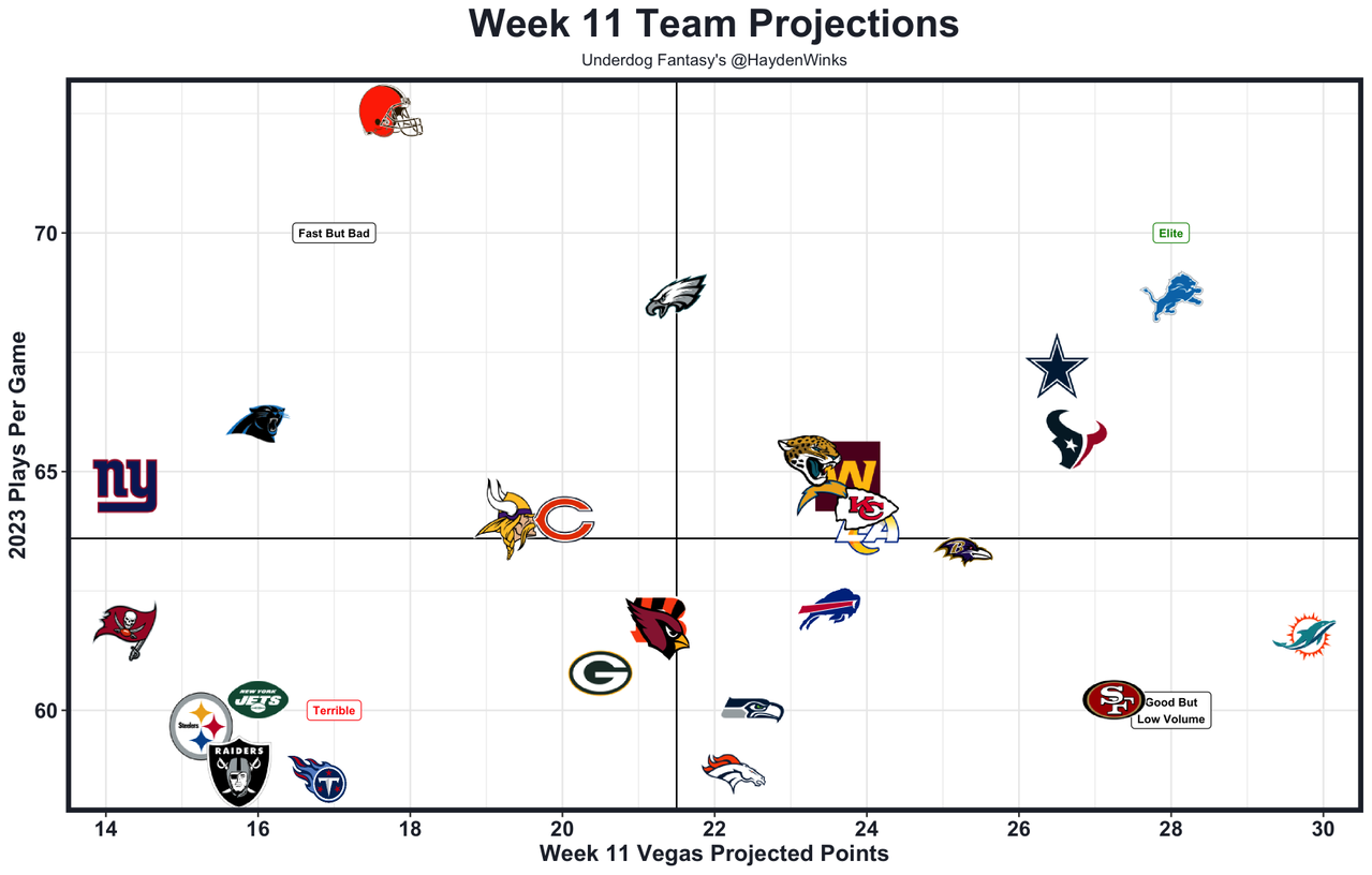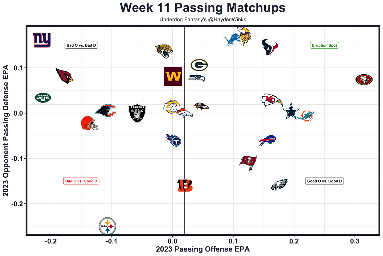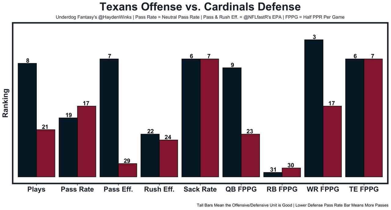 It's still a balanced offense in neutral situations, but at least the ground game worked fairly well last week while Stroud continues to host a downfield dart party. The Cardinals are 5th-worst in passing EPA allowed and the betting markets are ready to fire, giving the Texans (yes the Houston Texans with a rookie QB) the 3rd-highest team total of the week. Stroud, who is unquestionably a top-10 NFL QB already in my opinion, is returning his X-receiver in Nico Collins this week, too.