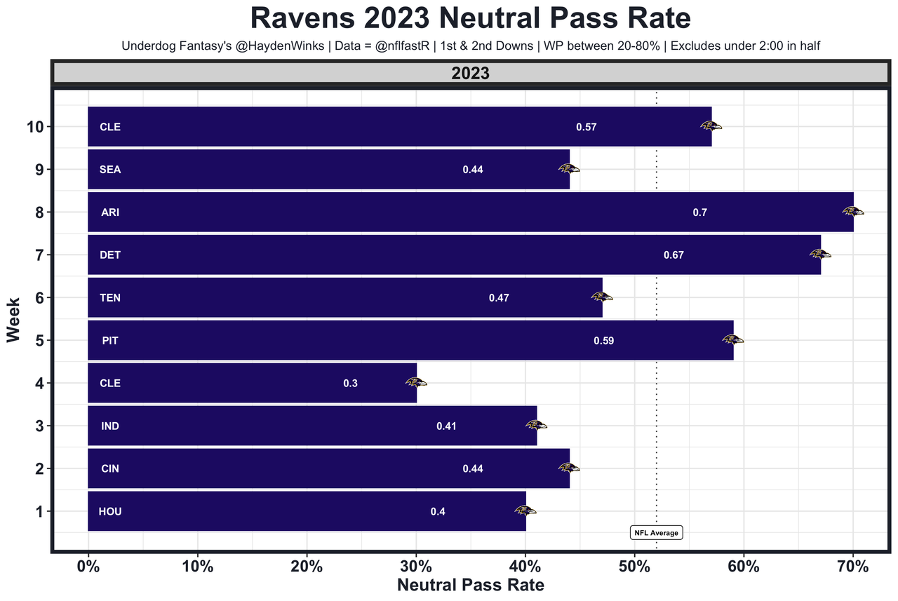 Gus Edwards - The Bus remains the lead and goal line back, but Keaton Mitchell continues to earn more schemed-up work. Mitchell's touches were two draws, one screen, one wheel route, and one end-around carry, so there's no evidence they fully trust him. That said, the results are impossible to argue with, at least in the context of Justice Hill is still playing on offense. Expect Edwards to be the goal-line hammer, while Mitchell has a zero-floor role with the upside of long scores. It's worth noting the Ravens are more pass heavy in October and November than they were in September.