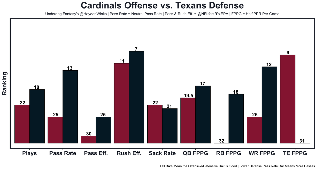 James Conner - He played 63% snaps, 42% routes, and was the goal line back in his return, but the rushing TDs went to Kyler Murray (zone read keeper) and tush push QB Clayton Tune instead. Bad luck. Conner had a couple of nice runs in a better-coached offense, so there's RB2 upside in good matchups. The Texans are league average or better in all rushing metrics. 81.5 total yards in Pick'em.
