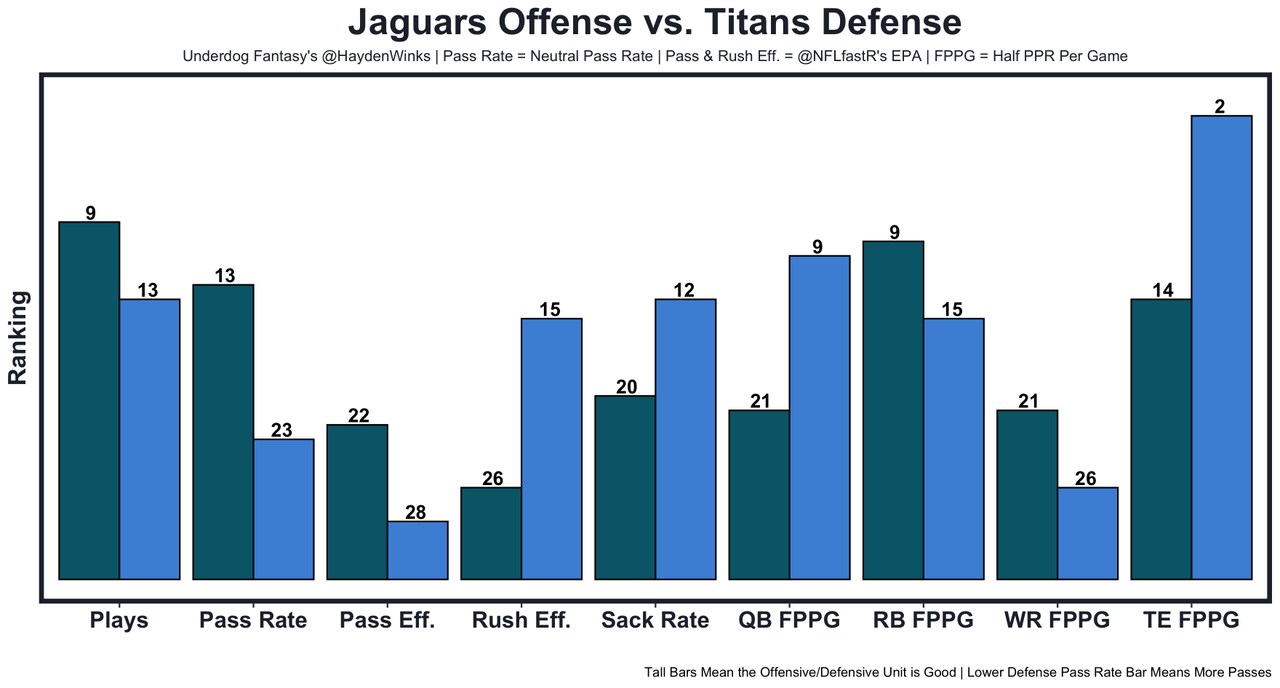 Travis Etienne - He had a season-low 8.2 expected half PPR points against an elite rushing defense last week, and things don't get much better here against the pass-funnel Titans. Etienne had 7-for-17 and 17-for-32 rushing lines (2.0 YPC) without a score against Tennessee last year. 14.75 fantasy points in Pick'em.