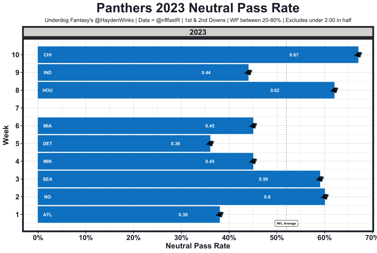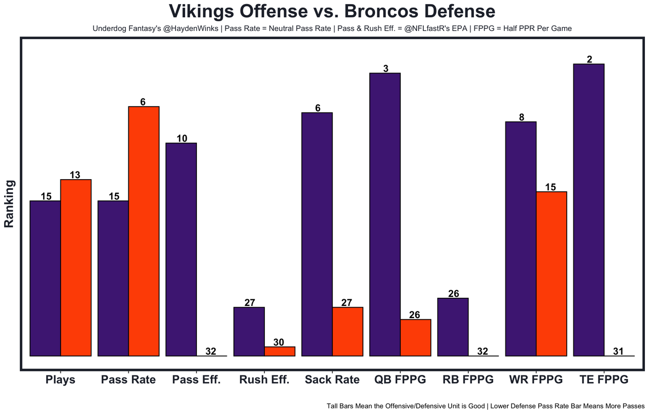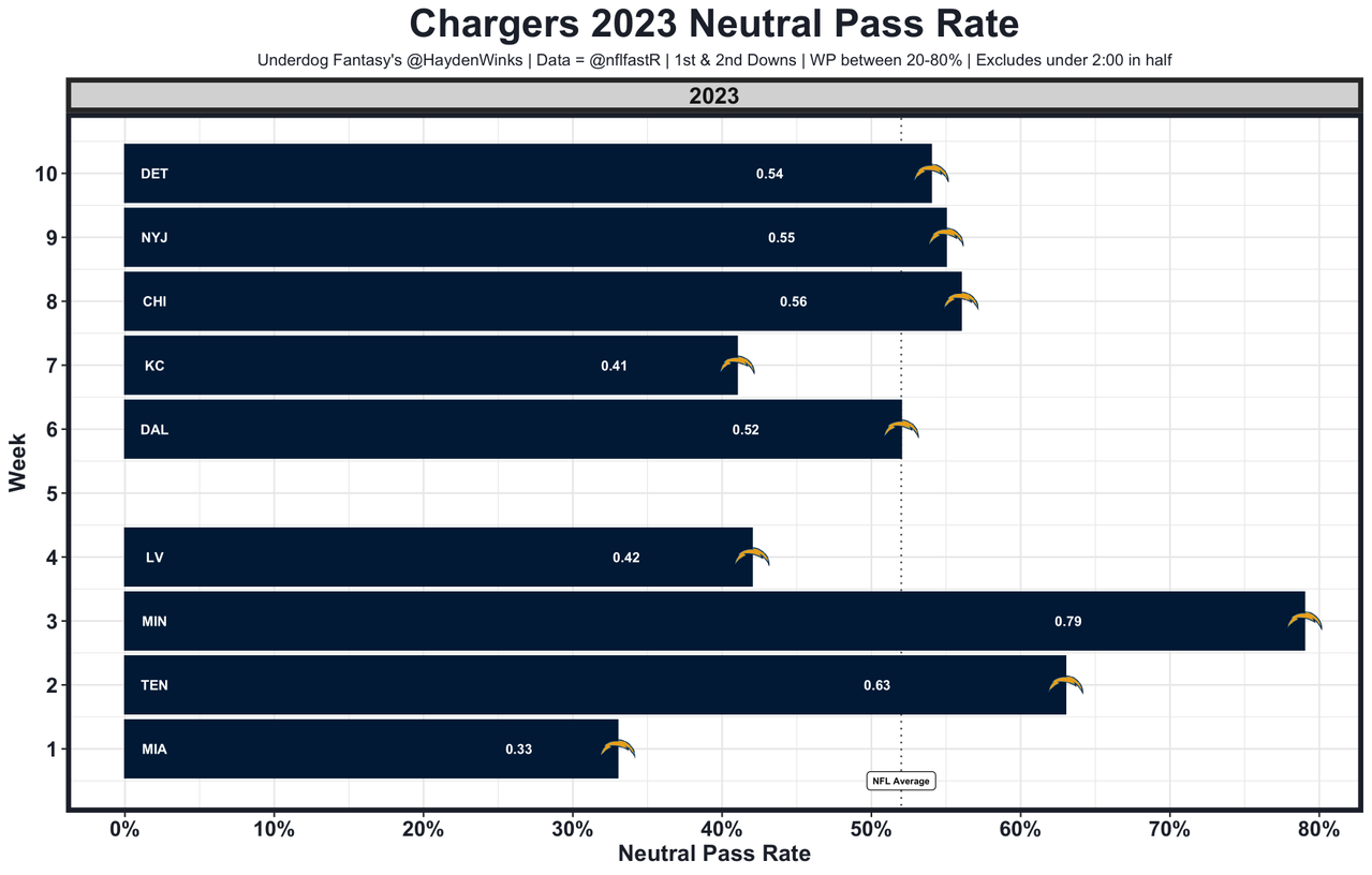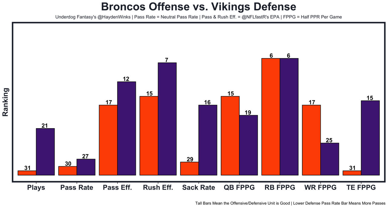 Javonte Williams - He's running really hard on tape and is now the RB2 overall in usage this month, with the Broncos defense allowing the offense to stay in neutral situations. Denver is 3rd-lowest in neutral pass rate, and Russ is flicking dumpoffs to Javonte on early downs even if he's not a full-time player. This week, Javonte is 2.5-point home favorites against the Vikings, though Minnesota has held RBs to just 3.6 YPC this season. 13.75 fantasy points in Pick'em.