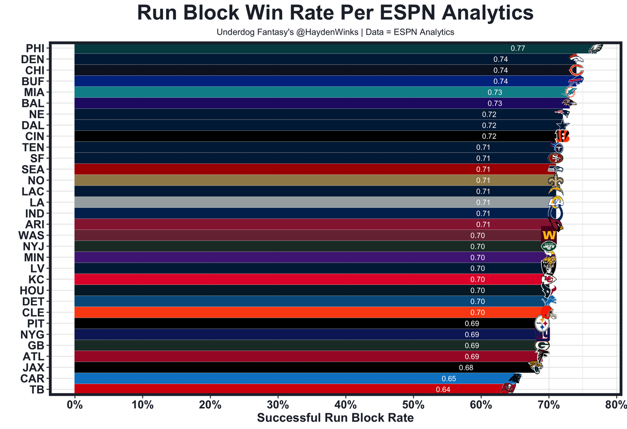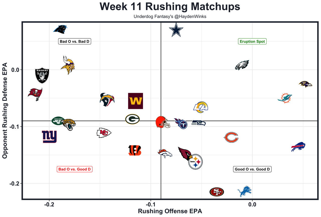 Chuba Hubbard - ESPN Analytics have the Panthers and Bucs run blocking as the worst, and it certainly feels that way. Hubbard is the RB40 on RB19 usage this month, while playing ahead of Miles Sanders. The Panthers offense (only projected for 15.75 points) has virtually no shot against the Cowboys, so Hubbard will need to PPR scam his way into relevancy here. Carolina is coming off a season-high 67% neutral pass rate. 51.5 total yards in Pick'em.