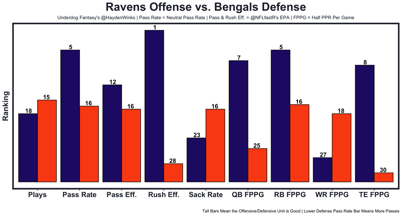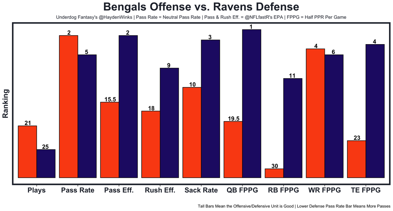 In 2021, Burrow had a legendary 525-4-0 passing game against Baltimore. In his games since then it's been a relative struggle, throwing for 217-1-1, 215-1-0, 222-2-1, and 209-1-0. The NFL has relatively slowed this offense down by forcing an outlier amount of short, outside throws, especially with downfield threat Tee Higgins missing from the offense. It's harder for Burrow to reach the elite QB1 tier with a dink-and-dunk approach. Baltimore ranks 1st against fantasy QBs, 2nd in passing EPA, 3rd in sack rate, and 5th in neutral run rate. All of that has sent Cincy's team total to just 21.25 points.