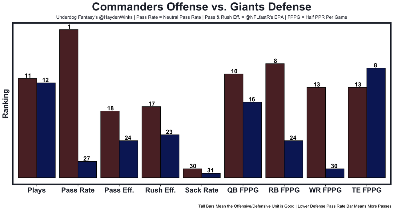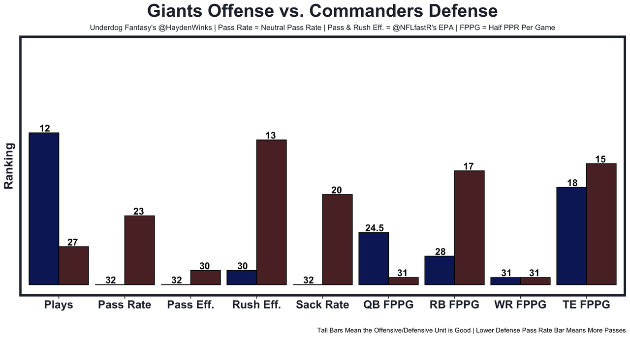 This is a great spot for Howell to continue on as a frisky QB1-2 option. The Commanders are 1st in neutral pass rate, and the Giants are so bad against the pass that offenses facing New York pass the ball at the 5th-highest rate in the NFL. Howell is very aggressive against man coverage (10.5 aDOT per Sports Info Solutions) and has the WR vs. CB advantage with a struggling Adoree Jackson and rookie CBs in the secondary. Washington's team total is parked at an above-average 23.5 points for a reason.