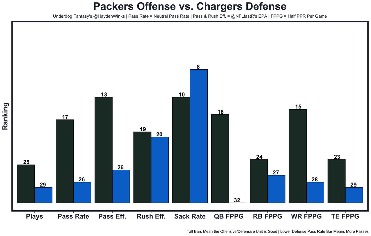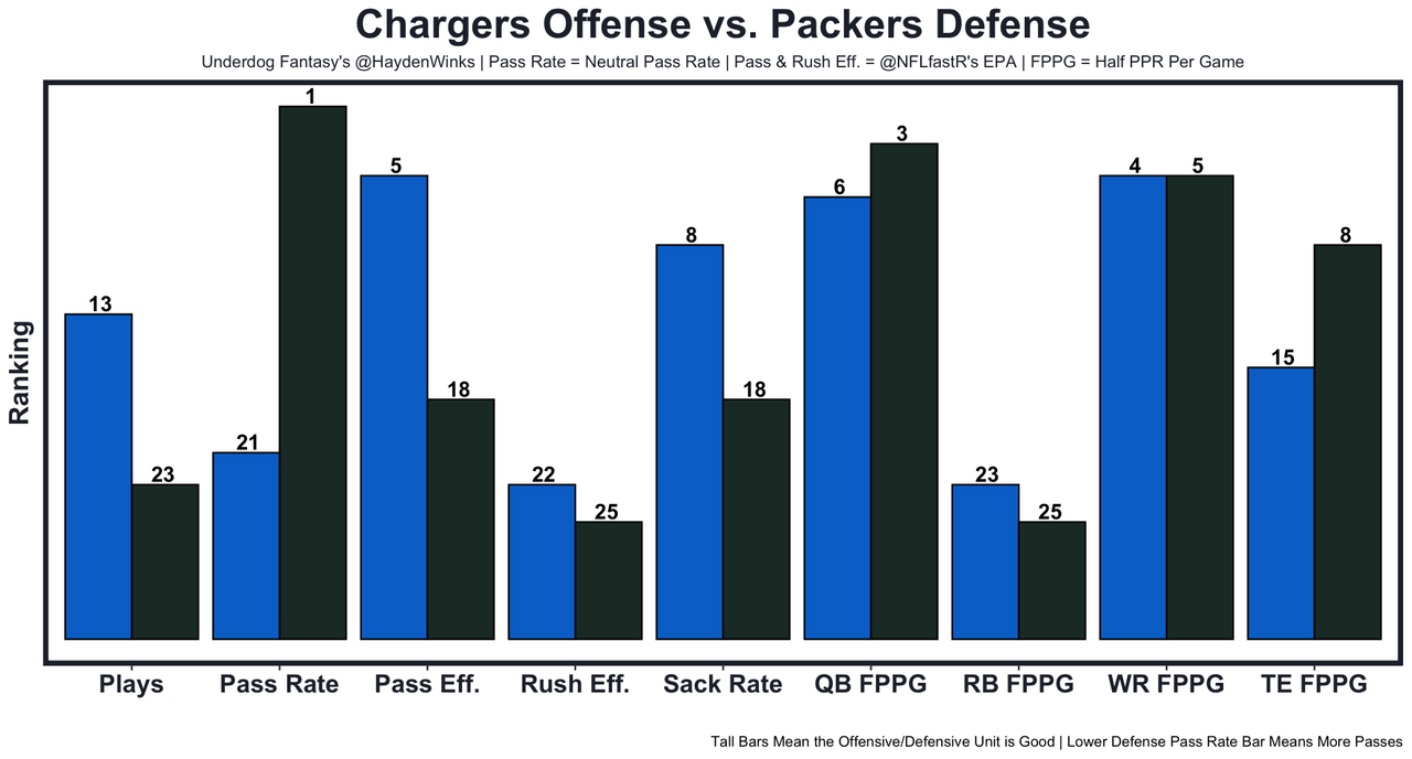 No C Corey Linsley, WR Mike Williams, WR Joshua Palmer, WR Jalen Guyton, TE Gerald Everett. This is a decimated skill group for the Chargers, who've played into their opposing defense's weaknesses throughout this season. The Packers are awful against the run typically, so a more balanced game plan wouldn't be a surprise here.