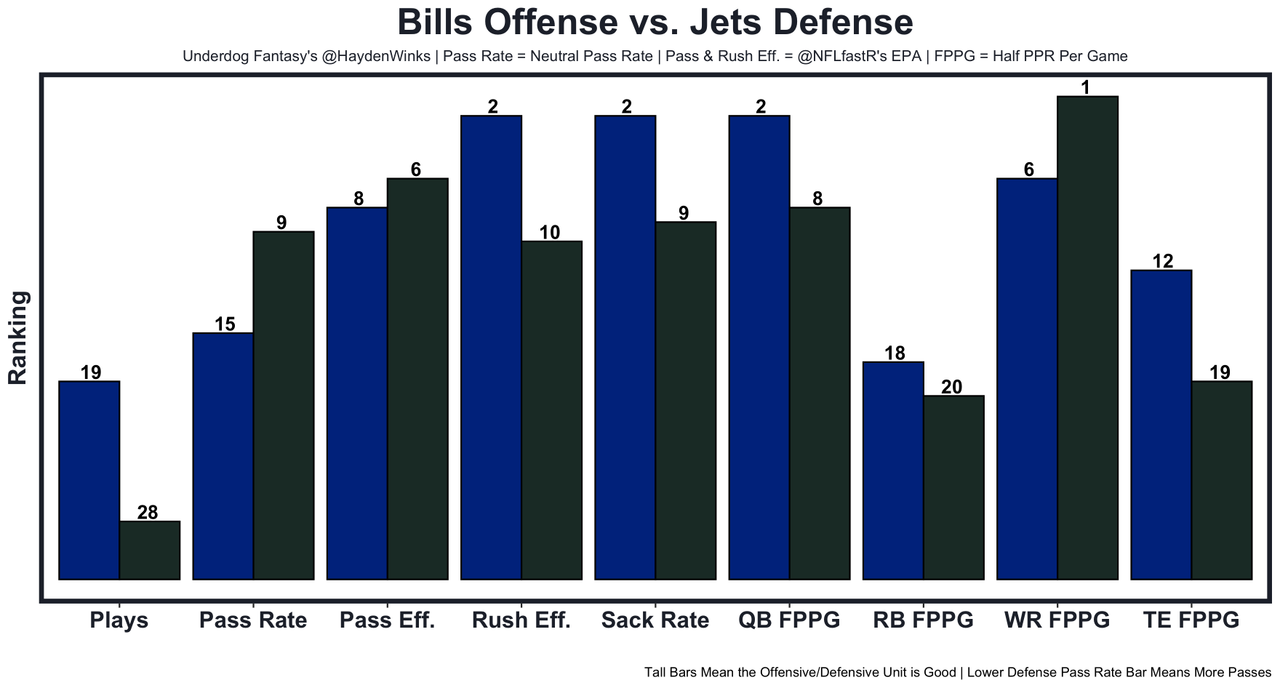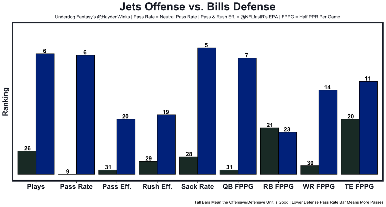 Breece Hall - He's averaging 16.0 half PPR points on 13.6 expected half PPR in his 5 clear starts, and there's a chance he'll see more pass-game involvement with Michael Carter (15 passing downs per game) released. As usual, a worrisome 16.5-point team total awaits Hall, but at least the Bills have allowed the most EPA per play since Week 5 when Matt Milano exited with a season-ending injury. 11.05 fantasy points in Pick'em.