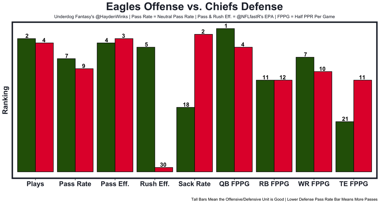 DeVonta Smith - His target share without Dallas Goedert has been 39% this year and was 27% last year per Sports Info Solutions. With him this year, Smith sits at 18%, so this is a big deal. He'll still need big plays to pay off with the Eagles run-first red zone offense, and the Chiefs are far worse against the run than the pass. That said, Smitty posted a 7-100-0 game on 9 targets in the Super Bowl. 54.5 receiving yards in Pick'em.