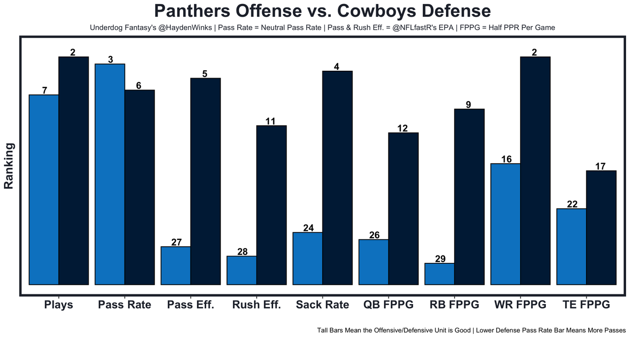 The Cowboys are more pass-heavy now than they've been since 2022, and it's certainly working. Dak is on fire with an upgraded pass-catching group and less-potent ground game. Carolina has been so bad against the run (and on offense) that they've been really good against fantasy QBs, but Prescott is on a legit MVP run right now (especially against bad teams). Their team total sits at the 5th-highest of the week.