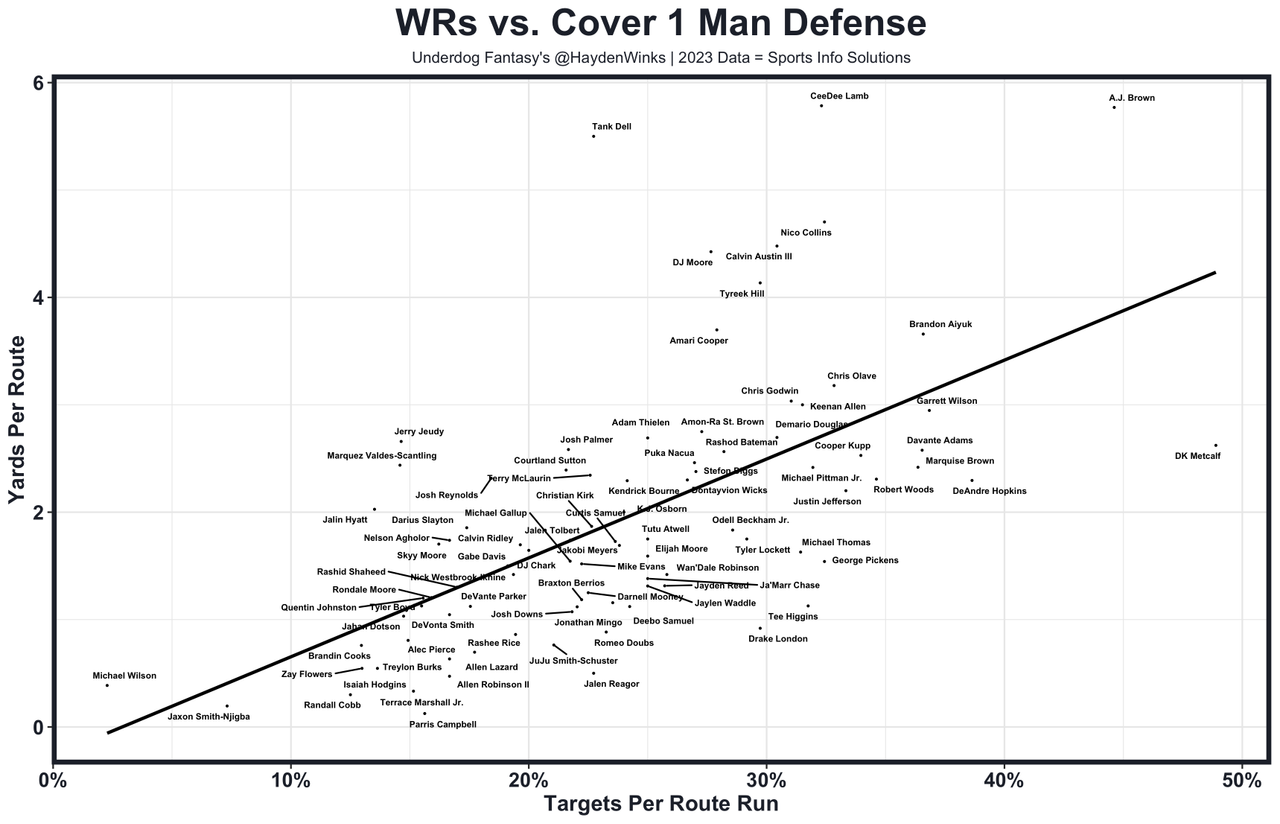 Terry McLaurin - The Giants play the most man coverage in the NFL, and McLaurin leads the team with a 1.9 yards per route run against single-high coverage compared to Curtis Samuel's 1.4 and Jahan Dotson's 1.2. The Commanders' 61% neutral pass rate this month has helped McLaurin rank 9th in fantasy usage. New York is 30th against fantasy WRs, and Adoree Jackson (DNP x2) and Deonte Banks (limited x2) are on the injury report. 58.5 receiving yards in Pick'em.