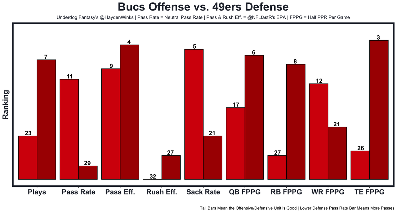 Chris Godwin - He had a season-low in usage last week while battling an illness and hasn't been a big-play threat for much of this season. A pass funnel defense does keep a potential PPR scam alive, despite a 14.75-point team total in San Francisco. 53.5 receiving yards in Pick'em.