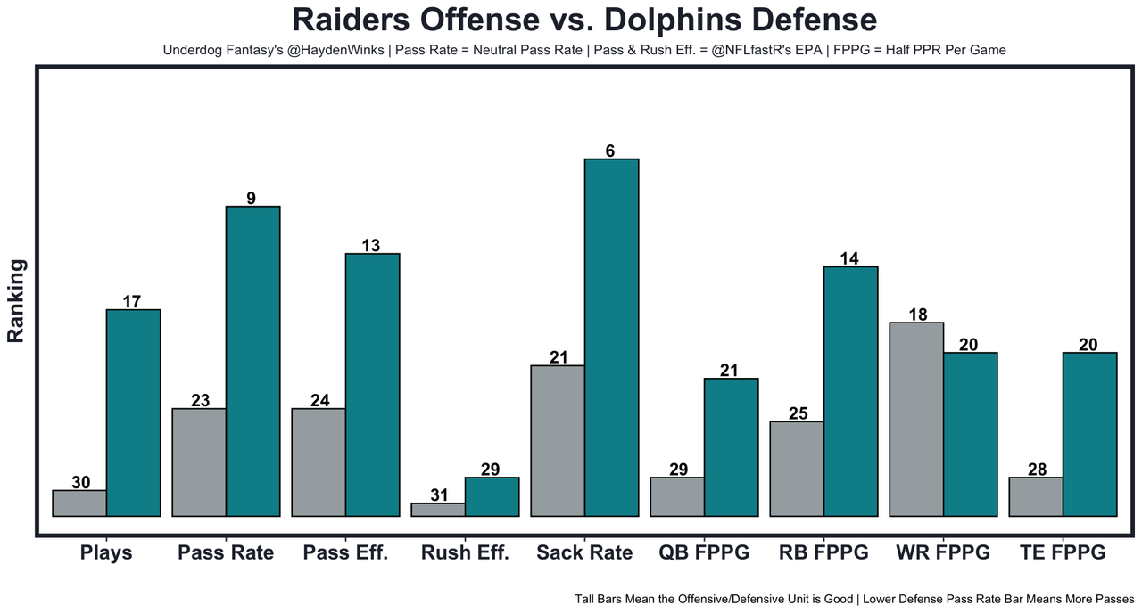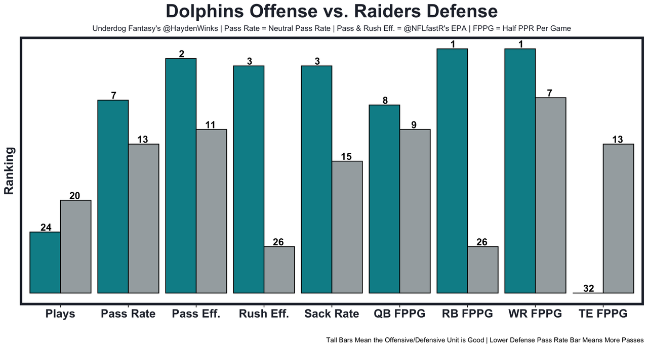 The Dolphins have the highest team total (30.0) this week, by far. Miami is back at home against a bad defense that hasn't played this offense before. In Mike McDaniel games outside the division, the Dolphins average 8.6 yards per attempt on 6.5% passing touchdowns, compared to 6.3 YPA on 3.5% TDs in the 10 games inside the AFC East. The Raiders haven't faced McDaniel yet.