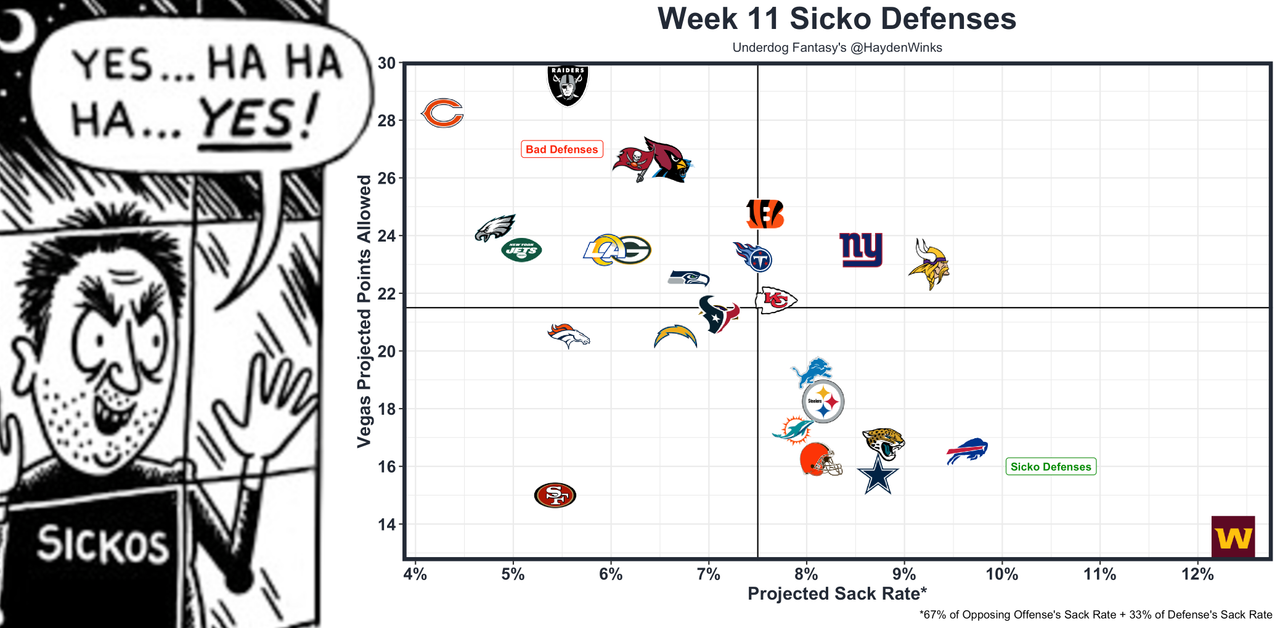The fantasy football defenses of Week 11 are the Cowboys (vs. CAR), Commanders (vs. NYG), Steelers (vs. CLE), Browns (vs. PIT), Bills (vs. NYJ), Jaguars (vs. TEN), Dolphins (vs. LV), Lions (vs. CHI), and 49ers (vs. TB).