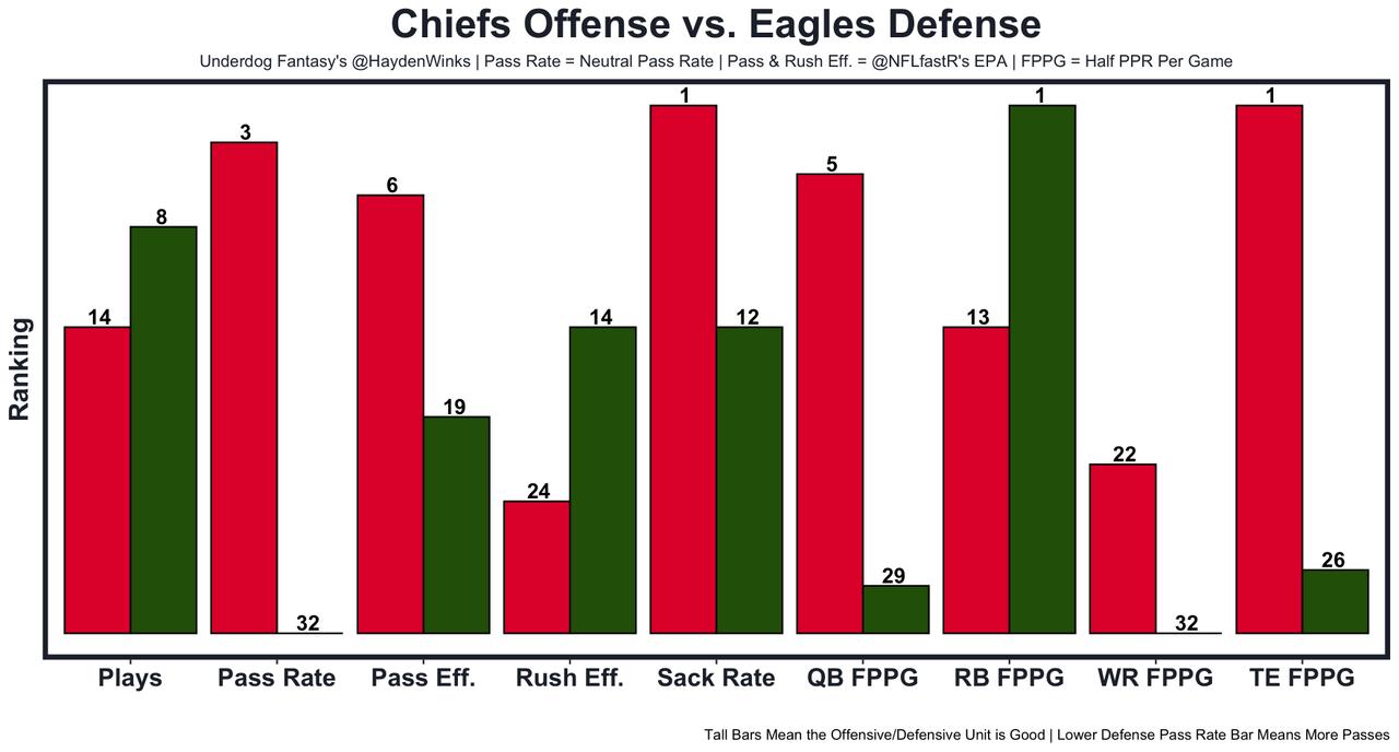 Andy Reid is 21-3 coming off a bye week, and the Chiefs had areas of potentially improve upon with some self scouting. This is very likely a very Mahomes-led game plan (as usual) with the Eagles better against the run than the pass. In fact, offenses facing the Eagles have the highest neutral pass rate, leading to a No. 28 ranking against fantasy WRs. He had 3 passing TDs on his highest postseason completion rate and 44 rushing yards against Philly in the Super Bowl. Ever heard of it?